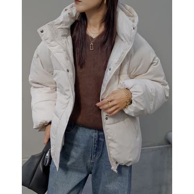 フード付きのスタンドカラーと、短めの丈感がトレンドライクなフェイクダウンジャケット。