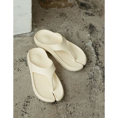 シンプルでありながら、どこか目を惹くマニッシュなトングサンダルです。