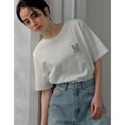 ブランドMEISMの「M」のロゴが、胸元にビジューで刺繍されたTシャツ。