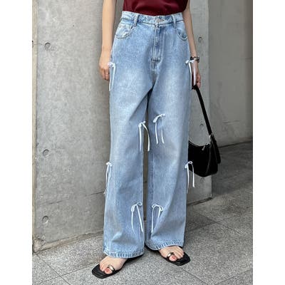 自分の好みの場所に付けられるリボン10点がセットになった、リボン付きワイドデニムパンツが登場。