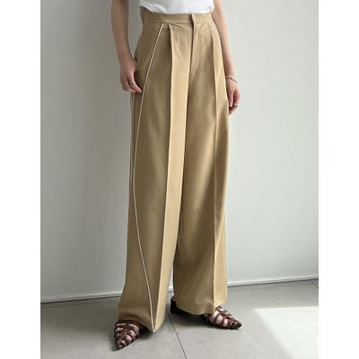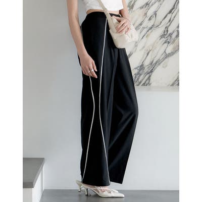 サイドに施されたパイピングがアクセントになった、ワイドパンツ。