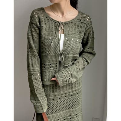 かぎ針ニット 透かし編み カーディガン トップス サマーニット ニット ニットトップス ニットカーディガン 長袖 コンパクト 前後2WAY セットアップ対応 フロントリボン リボン コットン100% 綿100% 羽織り 冷房対策 2024 SUMMER PRE ORDER COLLECTION 2024夏先行受注会 展示会 プレオーダー