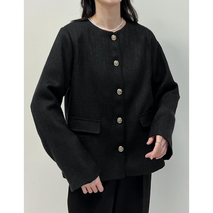 ▼デザインフォーマルからカジュアルまで、シーンを問わず活躍するノーカラージャケット。ツイードライクな表情のある素材が高見えするポイント。デイリーにも使いやすい、軽やかで動きやすい素材なので、ジャケットでありながらストレスフリー。金ボタンが上品さをプラスし、ボックスシルエットでこなれ感を演出します。ノーカラーデザインで、顔まわりがすっきりとした印象に。ホワイトのみ、サテン裏地付きで透けにくい仕様にしました。さまざまなアイテムと相性が良く、着回し力抜群のジャケットです。▼コーディネートテーパードパンツに合わせると、旬のオフィススタイルが完成。ブラックとホワイトはワントーンコーデにした、セレモニースタイルもおすすめです。▼素材表情のあるツイード風の素材