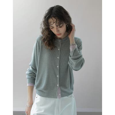 前立てと袖口の配色が目を引く、レイヤード風ニットカーディガン。