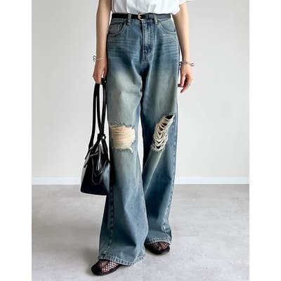 [低身長/高身長サイズ有]ダメージデニムワイドストレートパンツ
