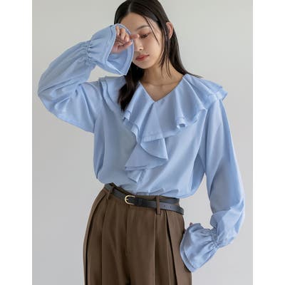 ひらひらと揺れるラッフルデザインが印象的なブラウス。大きめのラッフルカラーが顔まわりを華やかに演出し、女性らしい印象を引き立てます。Vネックのデザインですっきりとした印象に仕上がり、ベストやジャケットのインナーとして襟を出すスタイリングも今季のトレンド。襟と袖には二重のフリルをあしらい、後ろ襟は涙開き仕様で、レイヤードコーデでも襟をきれいに見せられるよう工夫されています。袖口はゴム入りのキャンディースリーブで、七分袖風にアレンジでき、残暑の時期にも快適に着られるのが嬉しいポイント。着やすさにもデザイン性にもこだわった、華やかなラッフルカラーブラウスです。