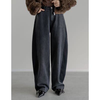 コットンデニムサイド切り替えバレルレッグカーブパンツ