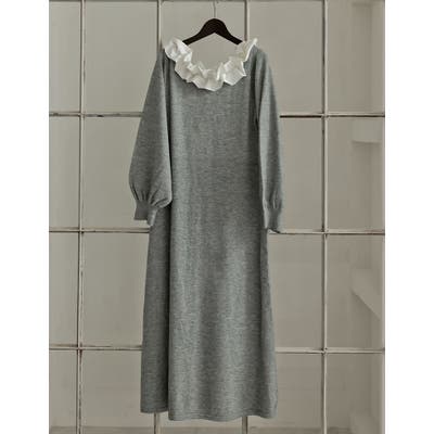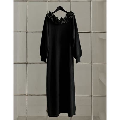 襟まわりにタフタ素材のフリルをあしらった、華やかで上品なニットワンピース。