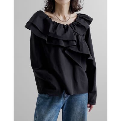 大胆なアシンメトリーフリルが、モードな甘さを演出するブラウス。