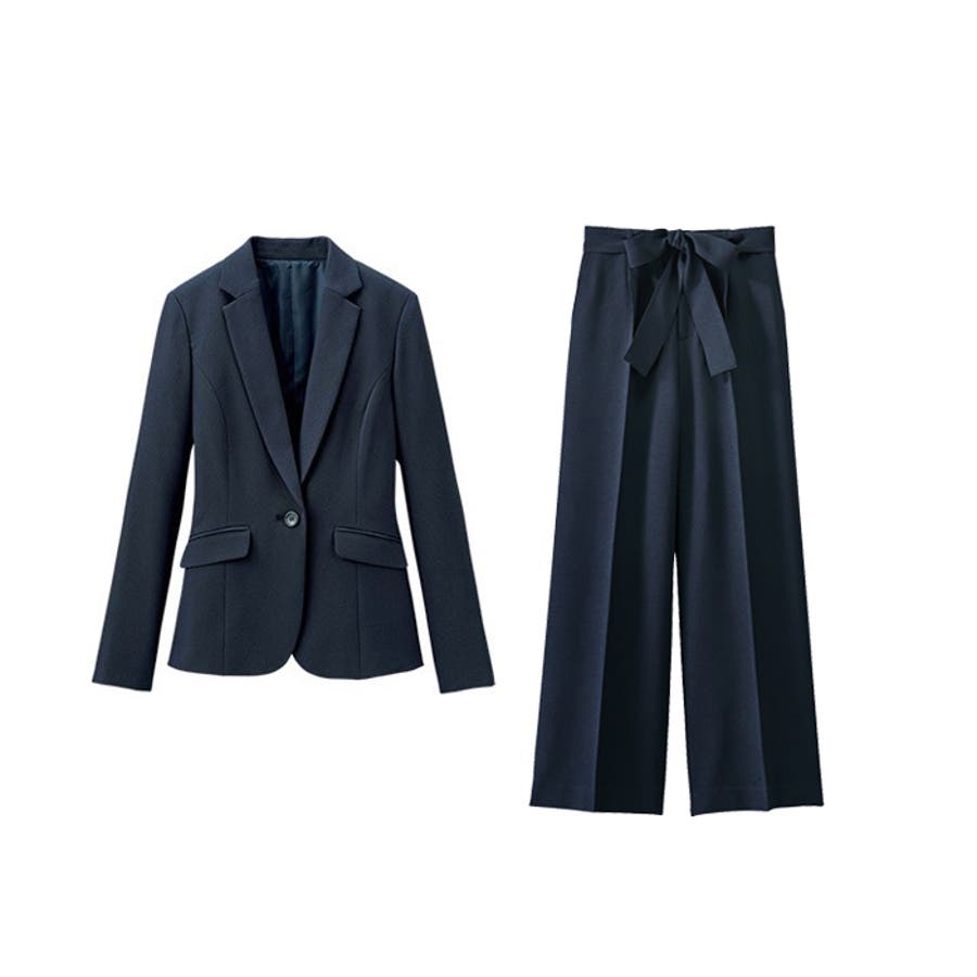 ベーシックなデザインで着回し力抜群な2点セットのパンツスーツ。