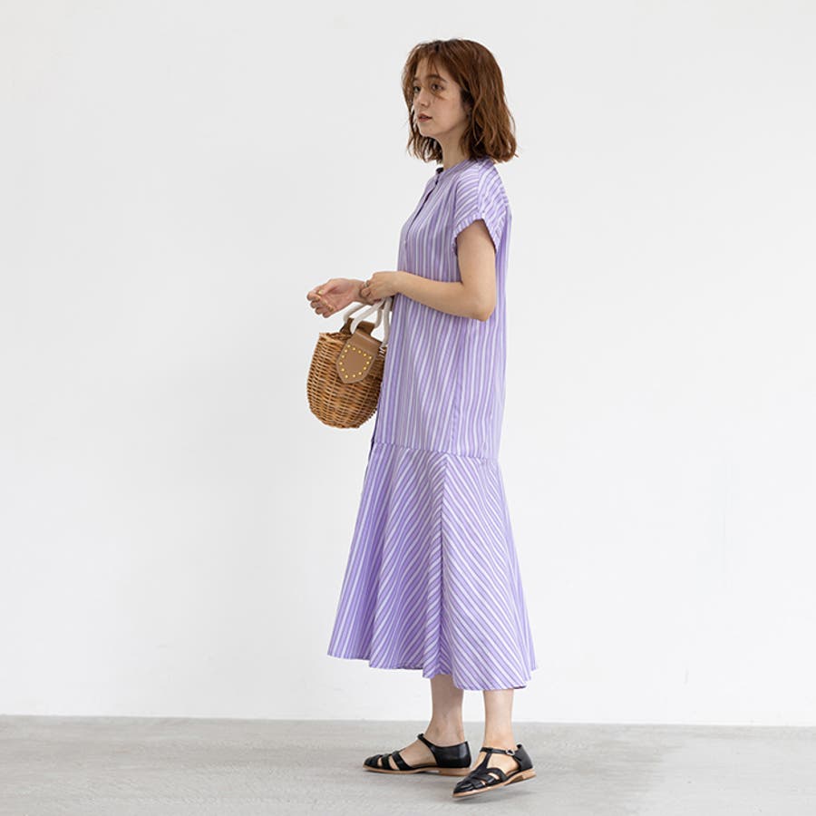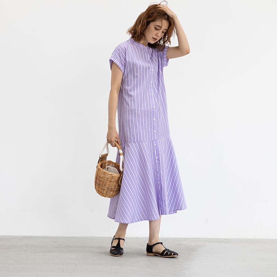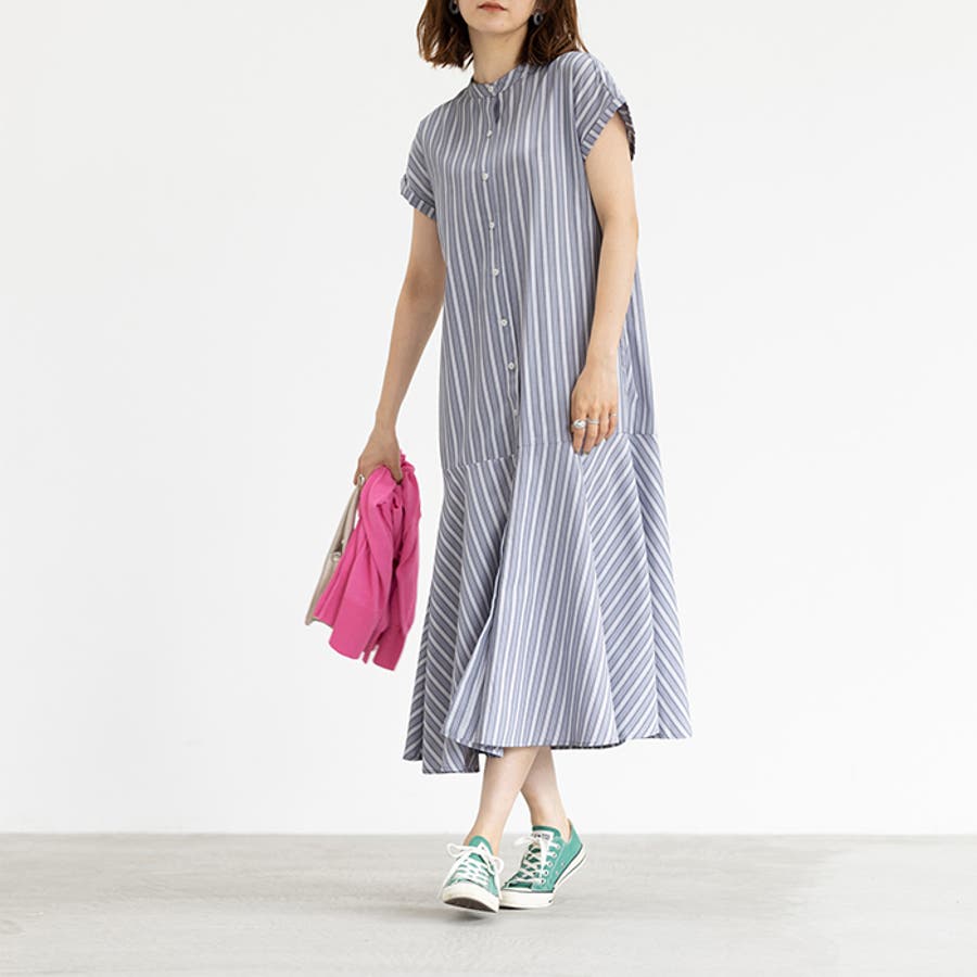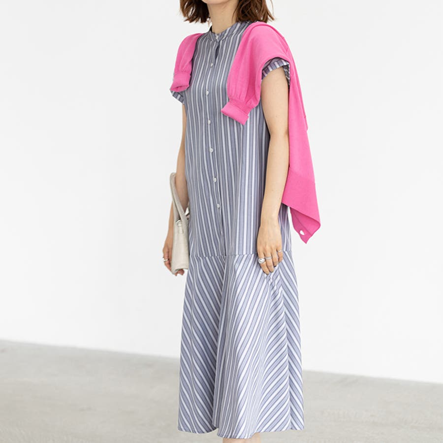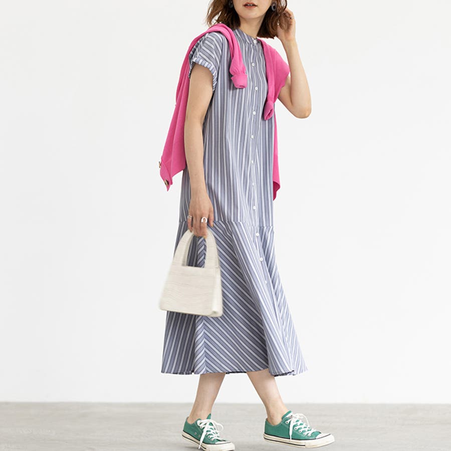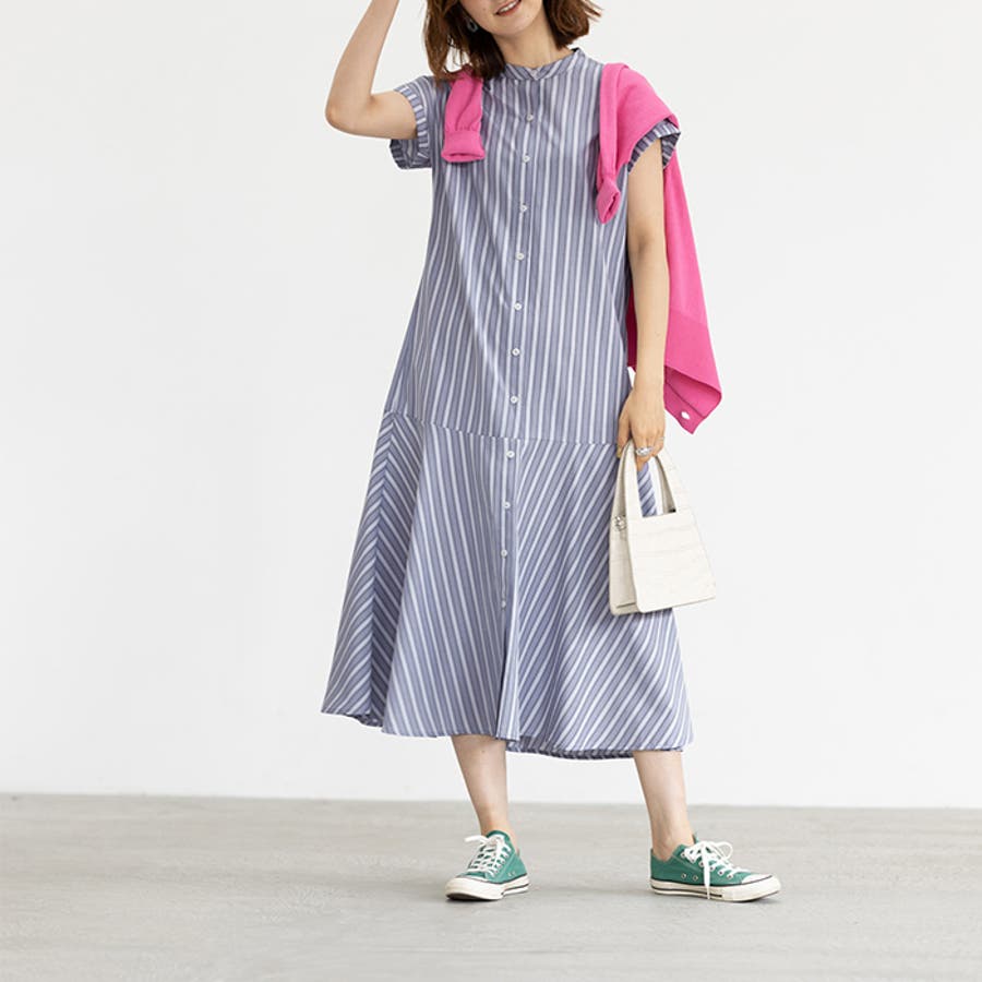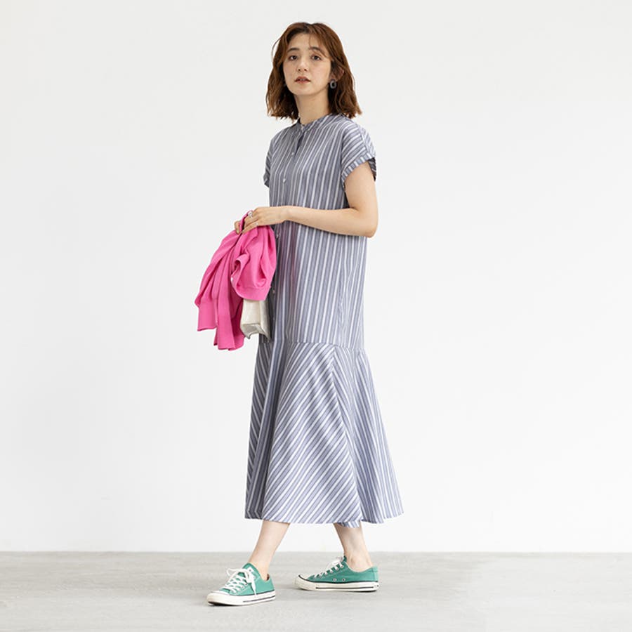 トレンド感を高めるマルチストライプ柄が印象的なワンピースだから、さらりと1枚着るだけでサマになります。