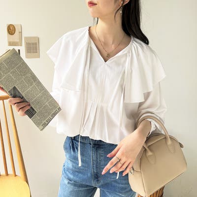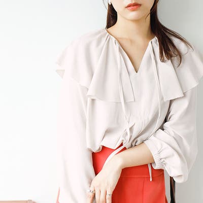 フリルカラー&ボリュームスリーブが着映えるブラウス。