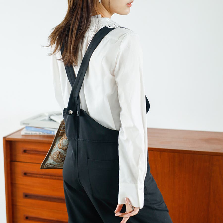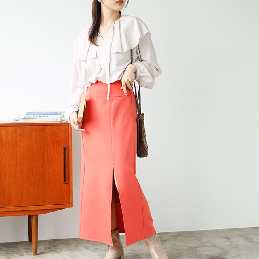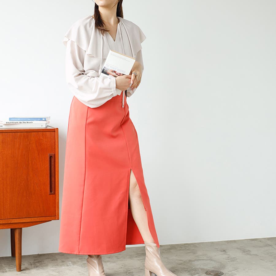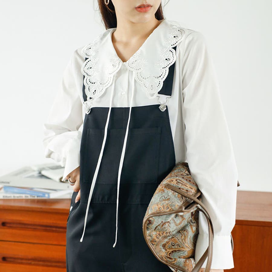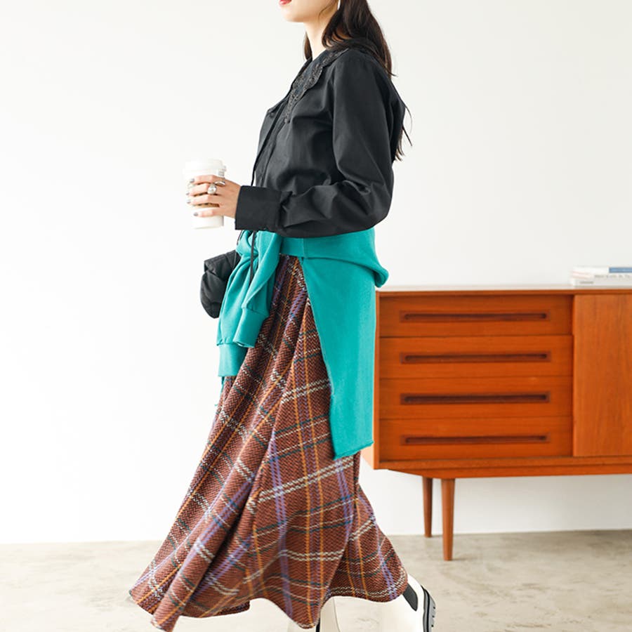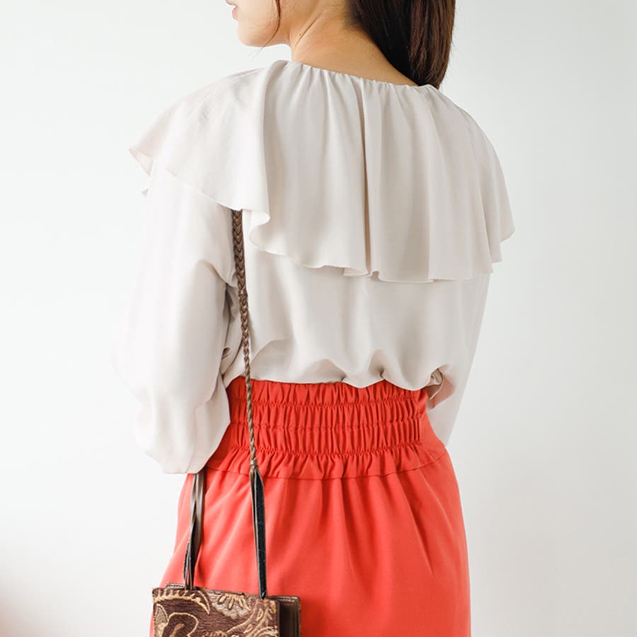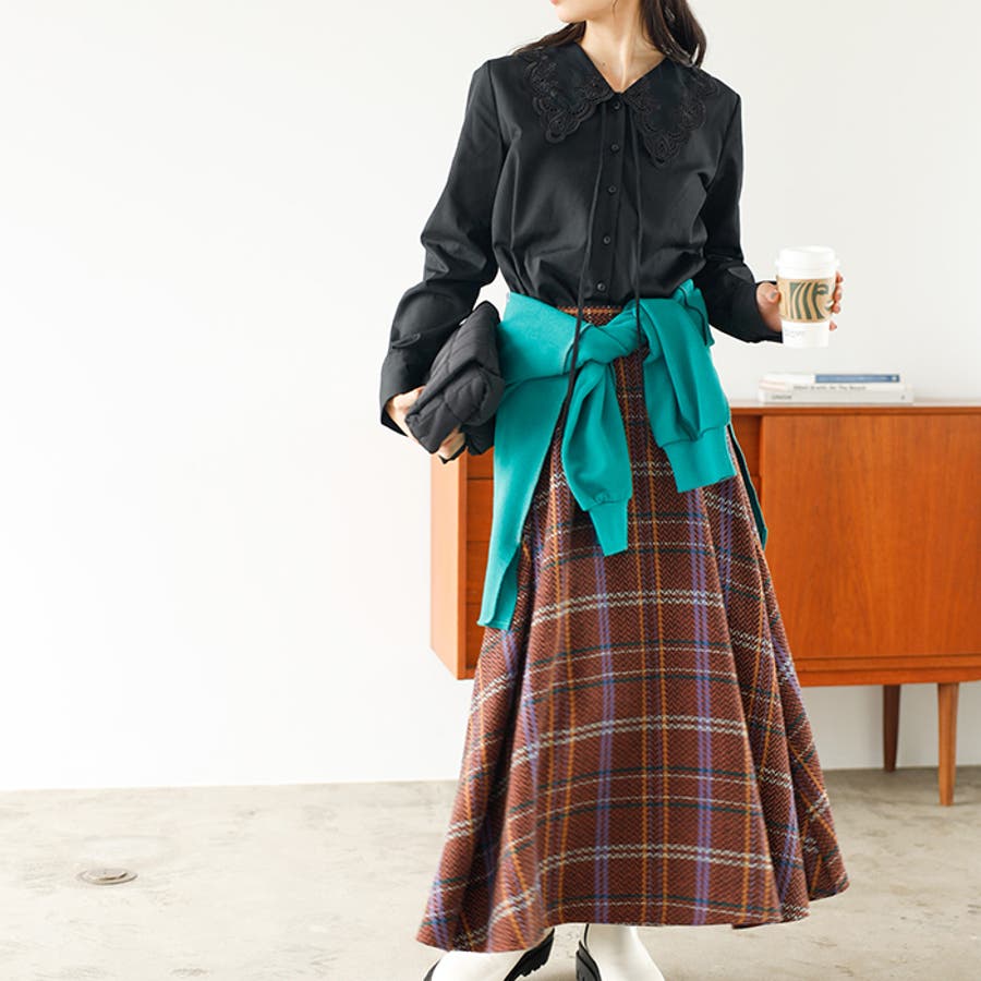 ウエストインで着るのがおすすめ。衿デザインに注目が集まるスタイリングに。