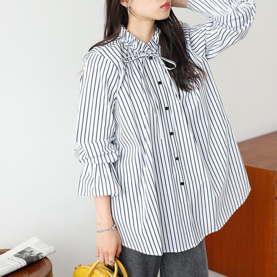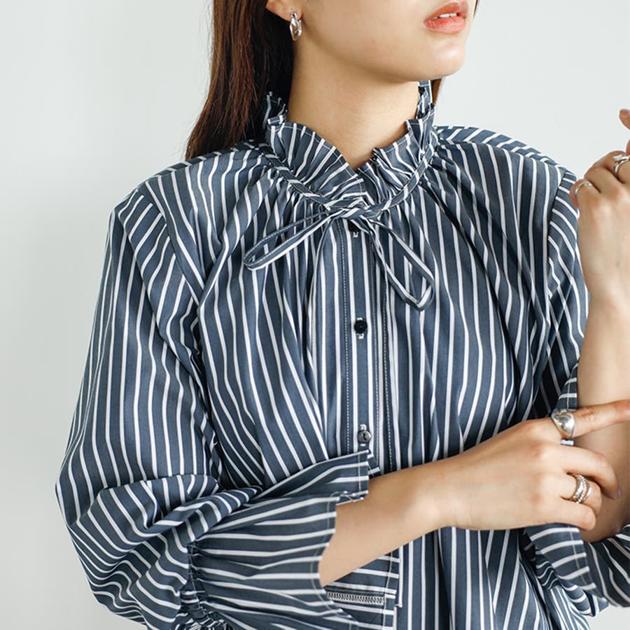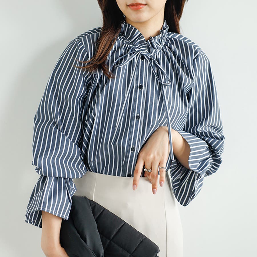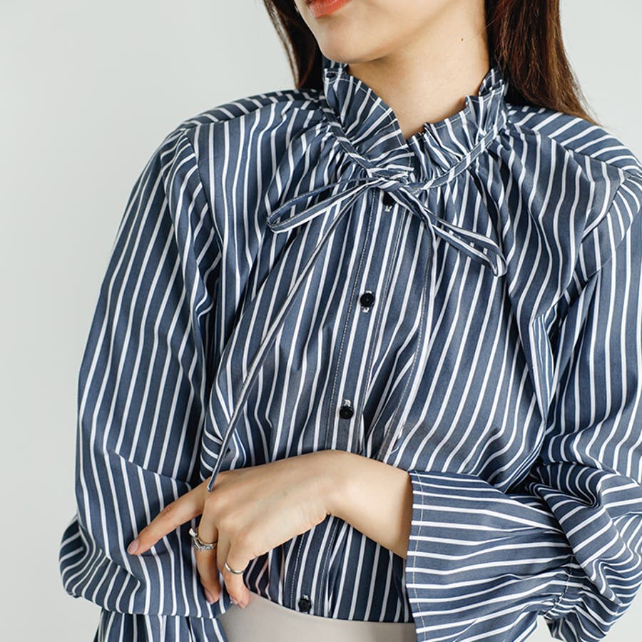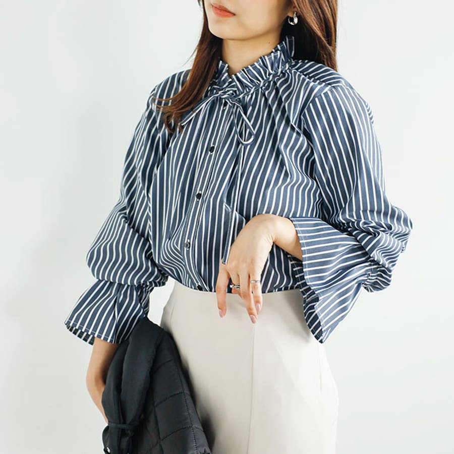 女性らしいデザインをストライプでシャープな印象にした大人っぽいブラウスです。