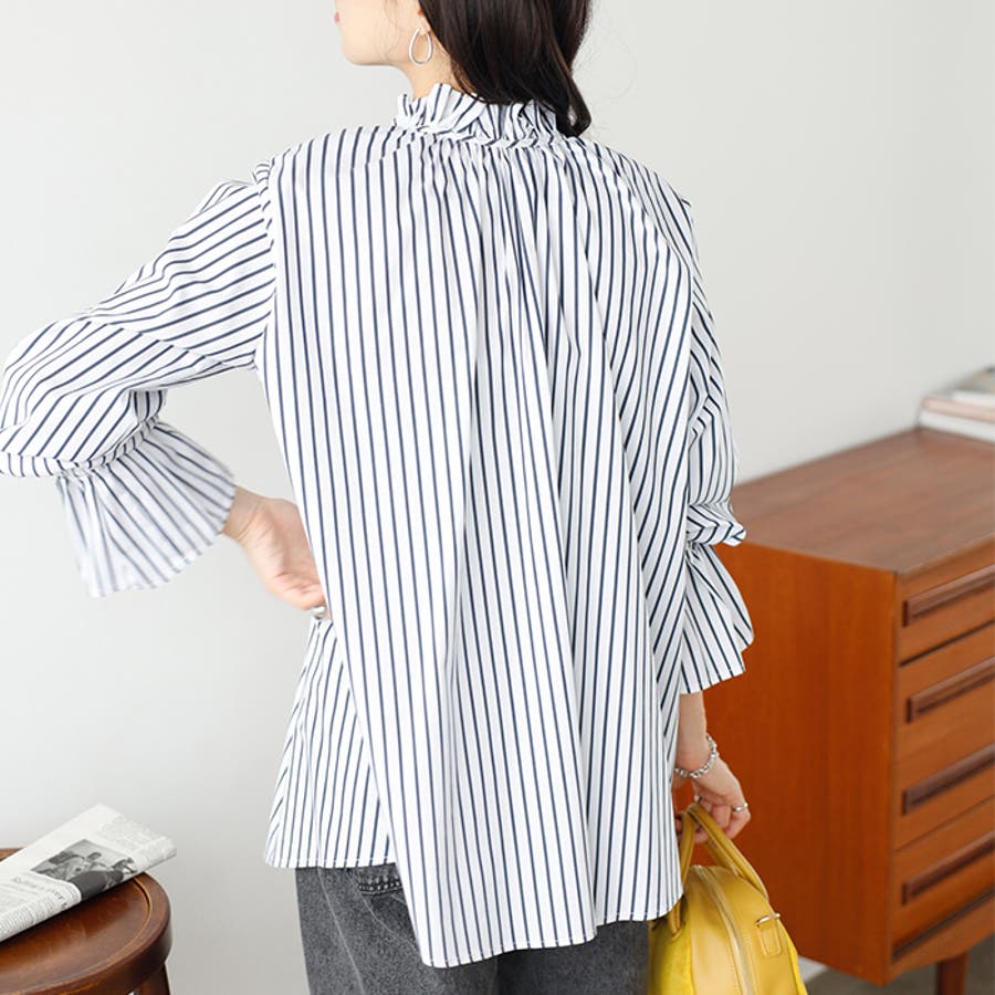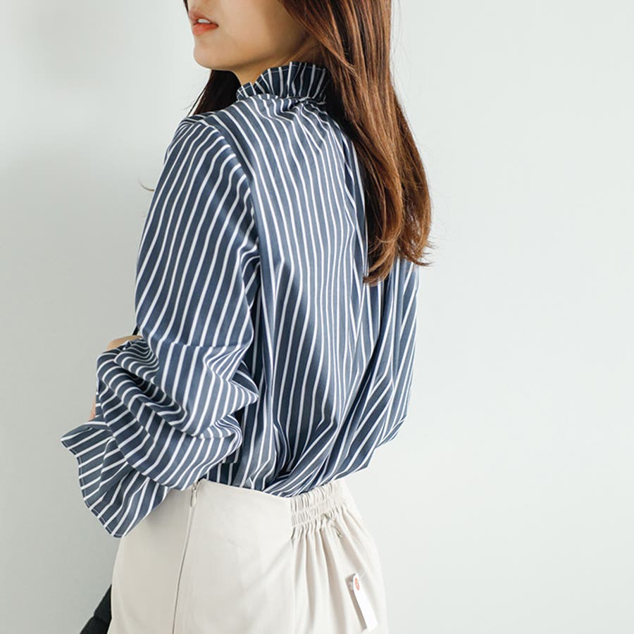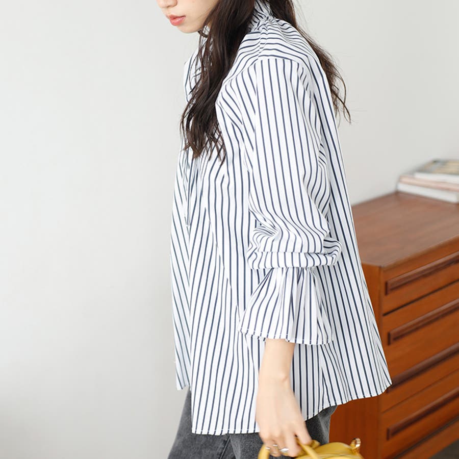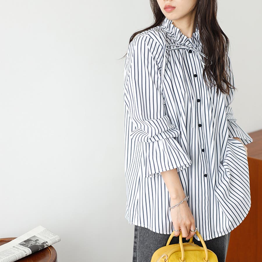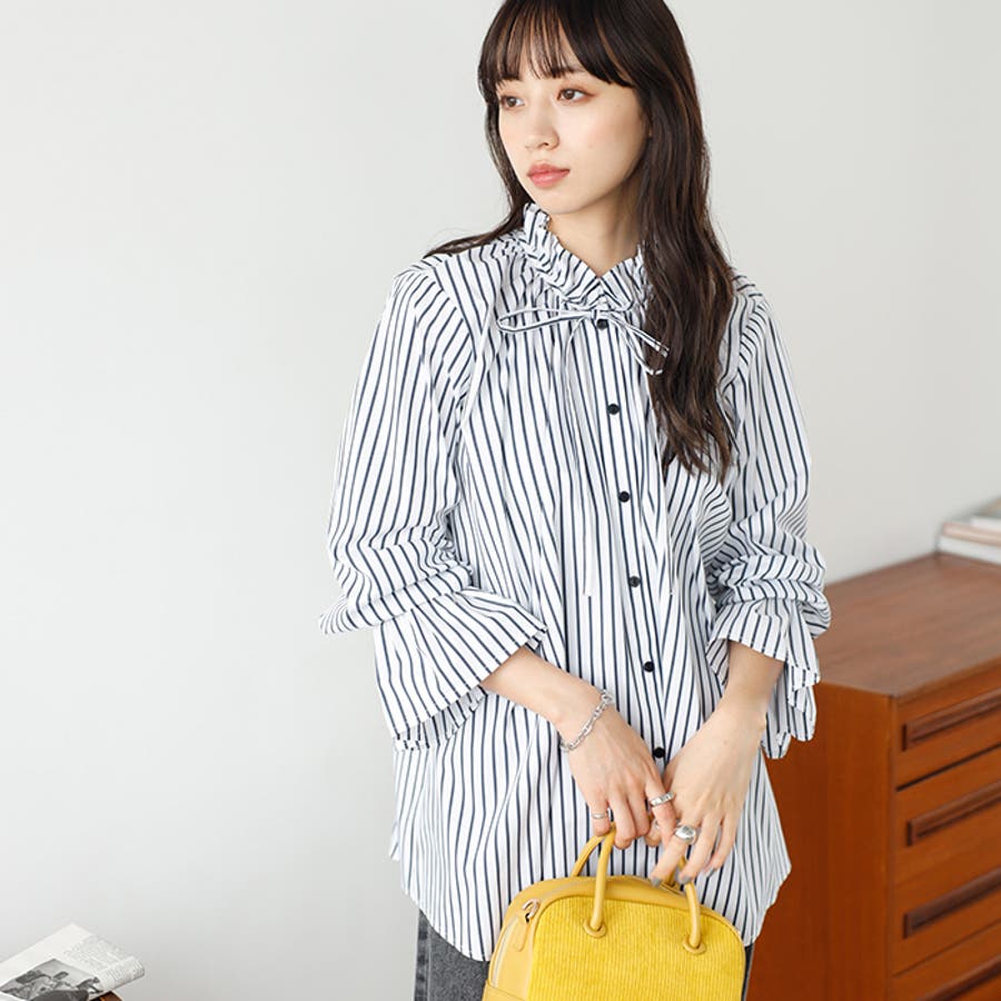 女性らしいデザインをストライプでシャープな印象にした大人っぽいブラウスです。