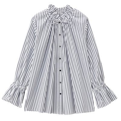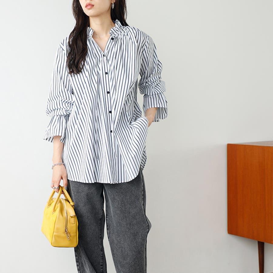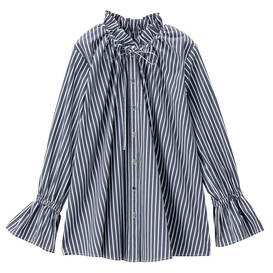 グレーのストライプが珍しく購入しました。袖口の絞られているデザインも襟のフリルもとてもよいと思います。カーディガンやトレーナーなど色々着まわしできそうです。