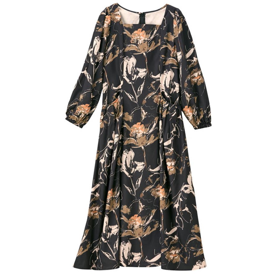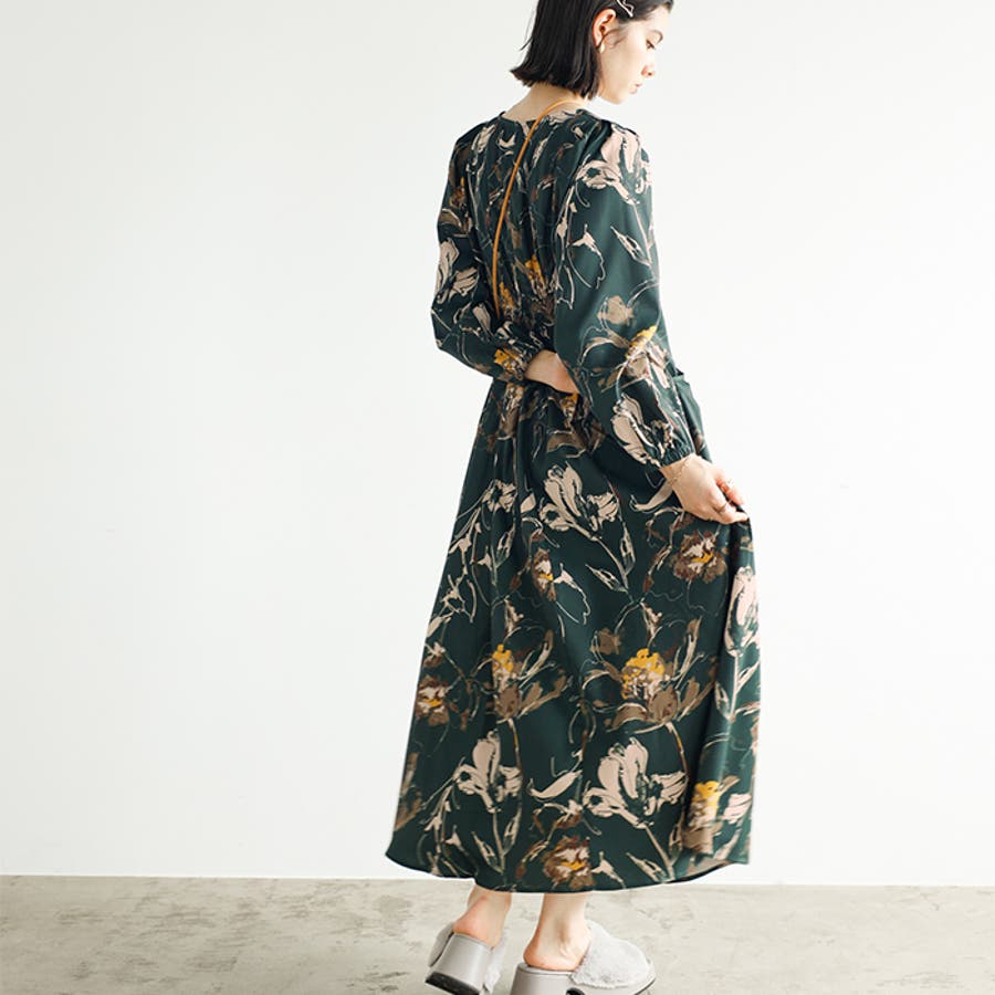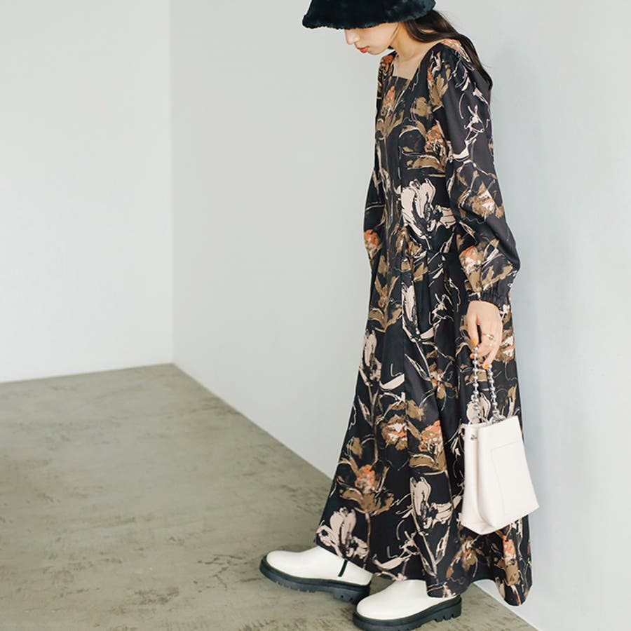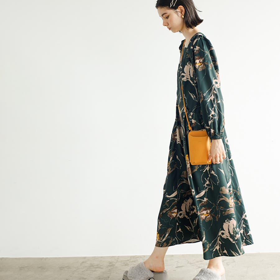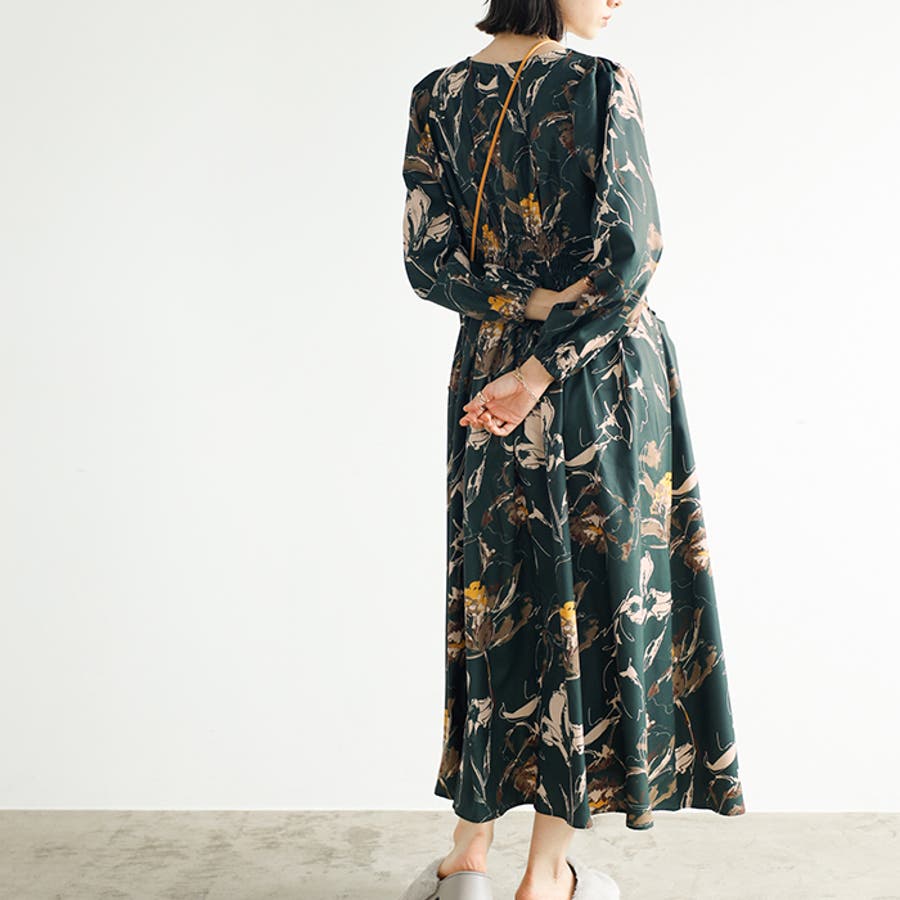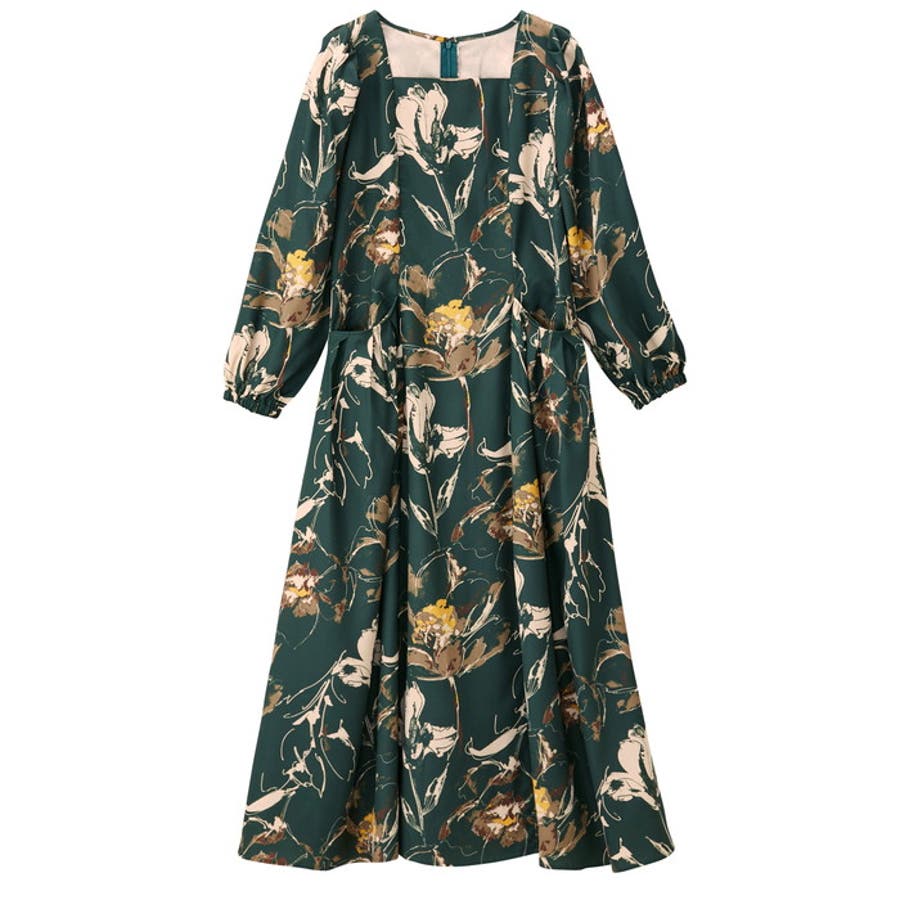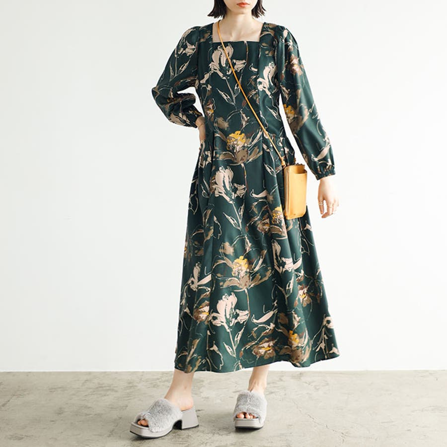 【グリーンケイ】スクエアネックプリントロングワンピース