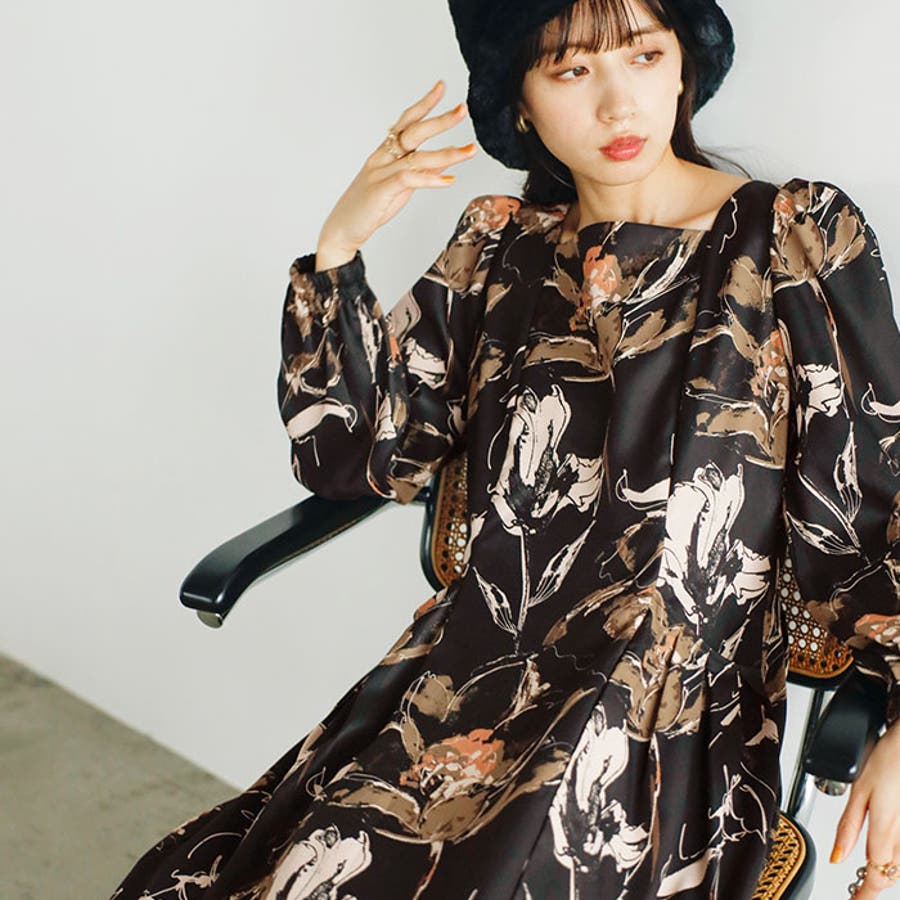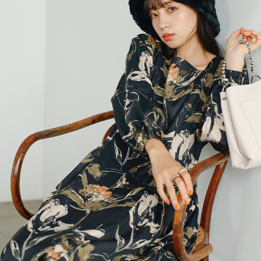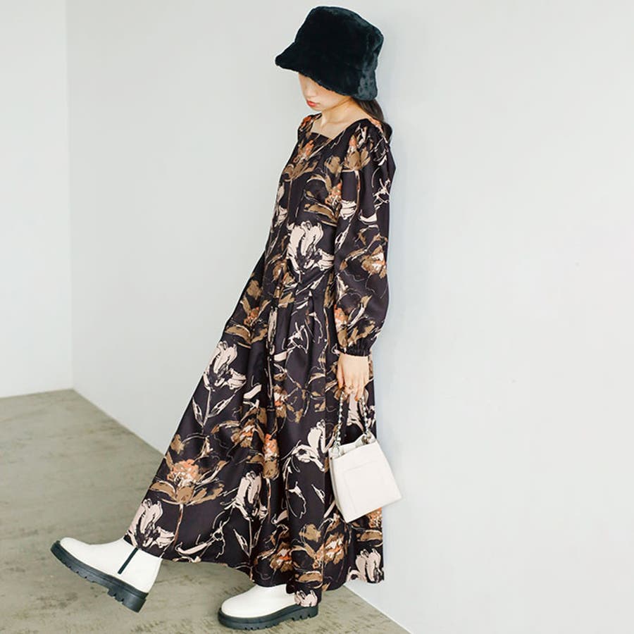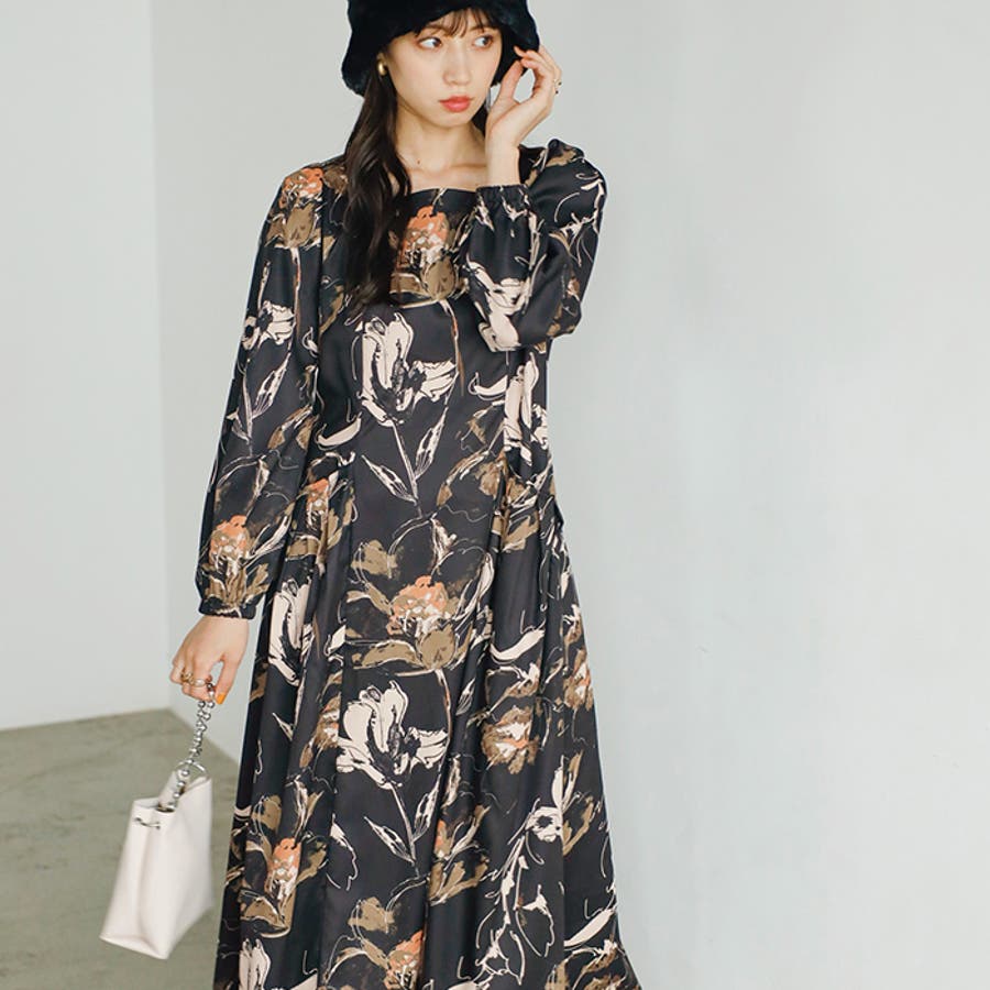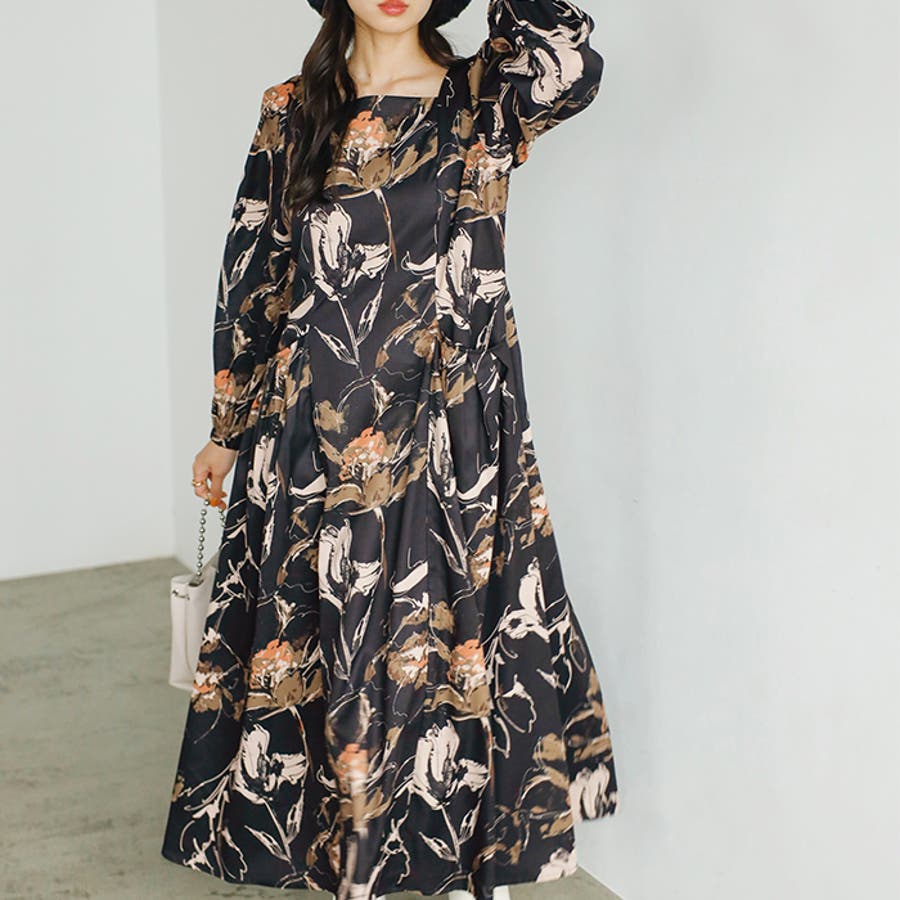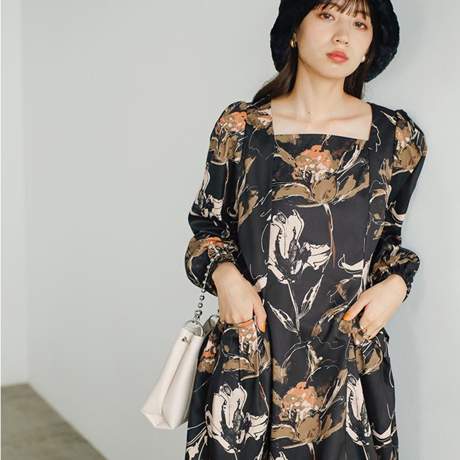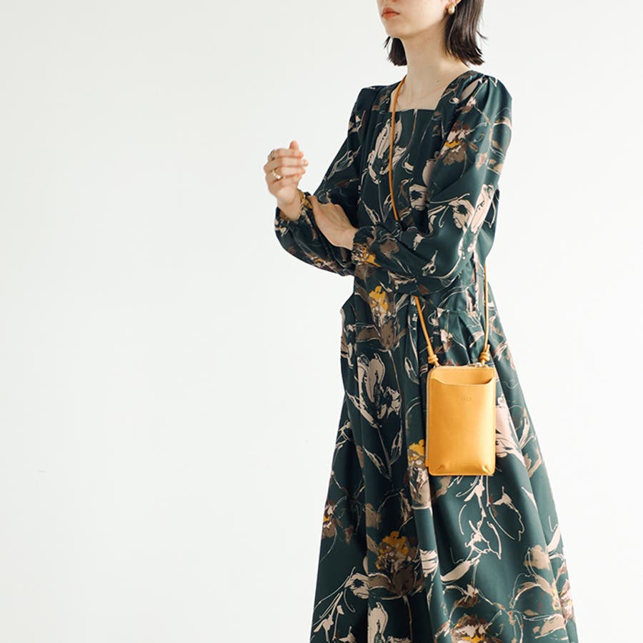 【グリーンケイ】スクエアネックプリントロングワンピース