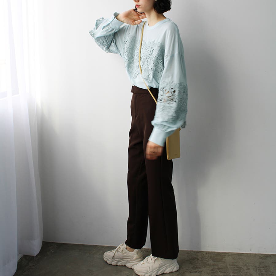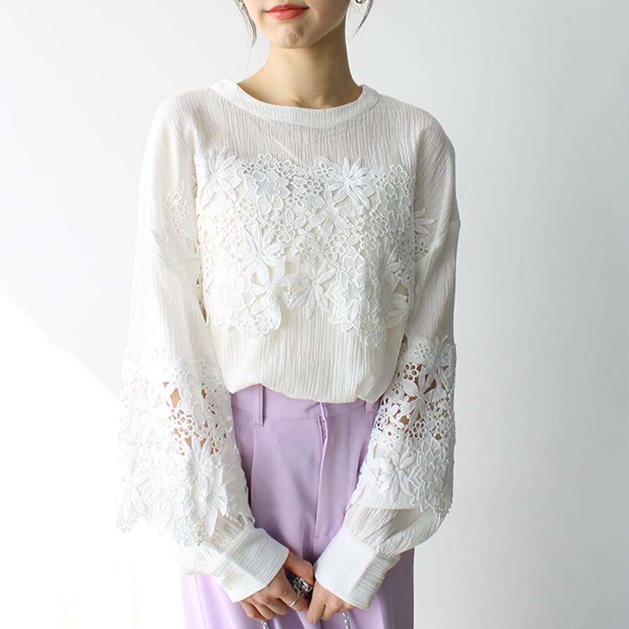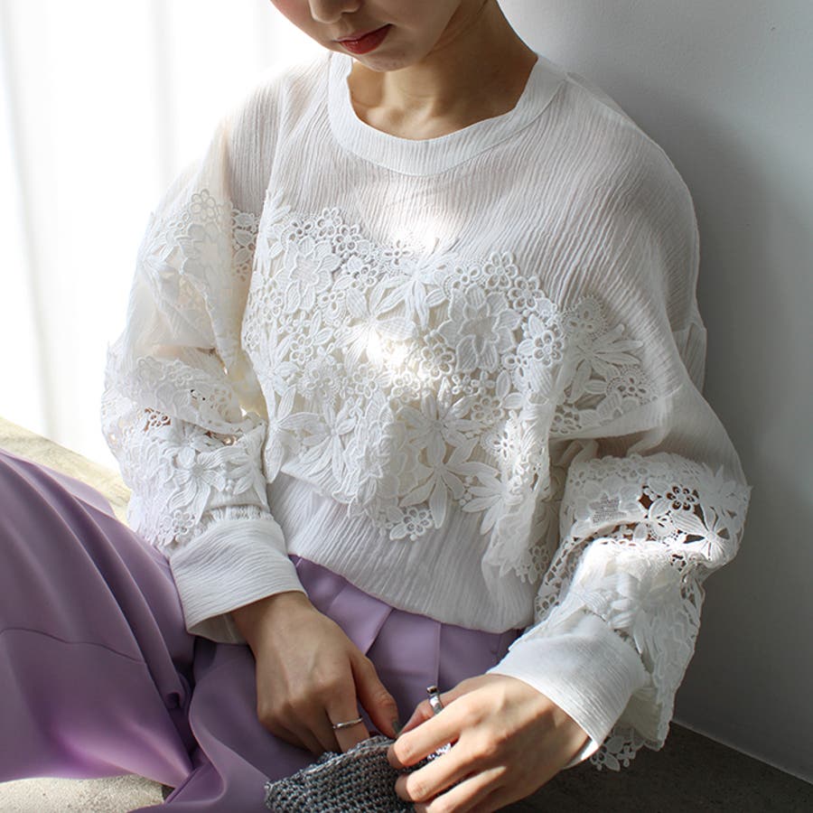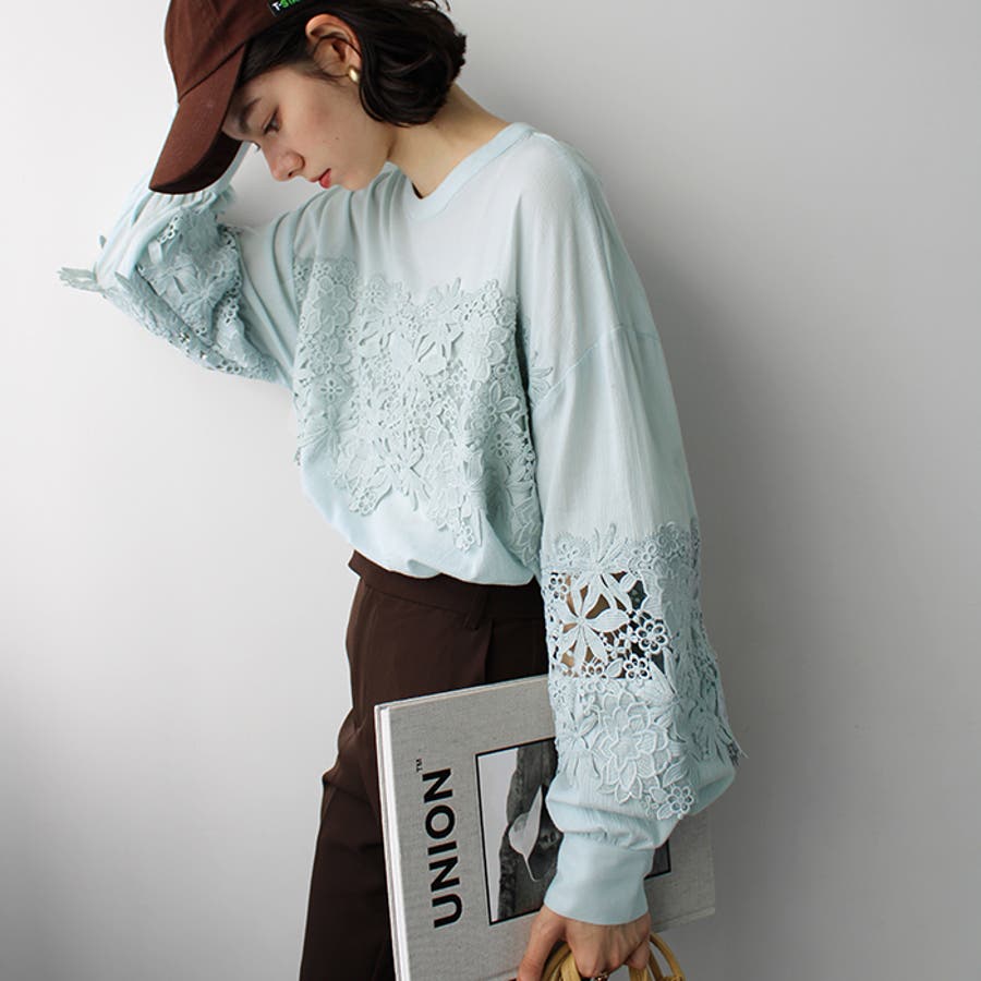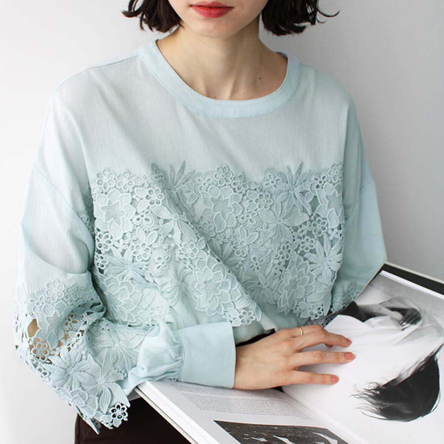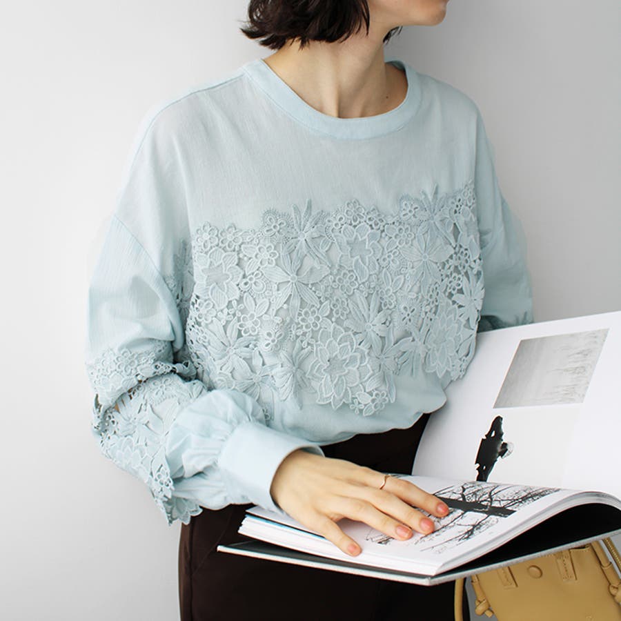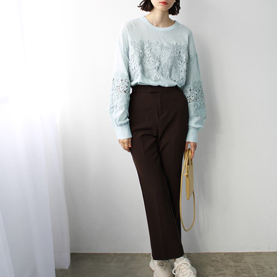 フラワーレースが映えるトップスなので、普段のボトムに合わせるだけでスタイリングが完成♪