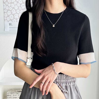 〇シンプルながらも、袖口のシアー素材と配色がポイント!
