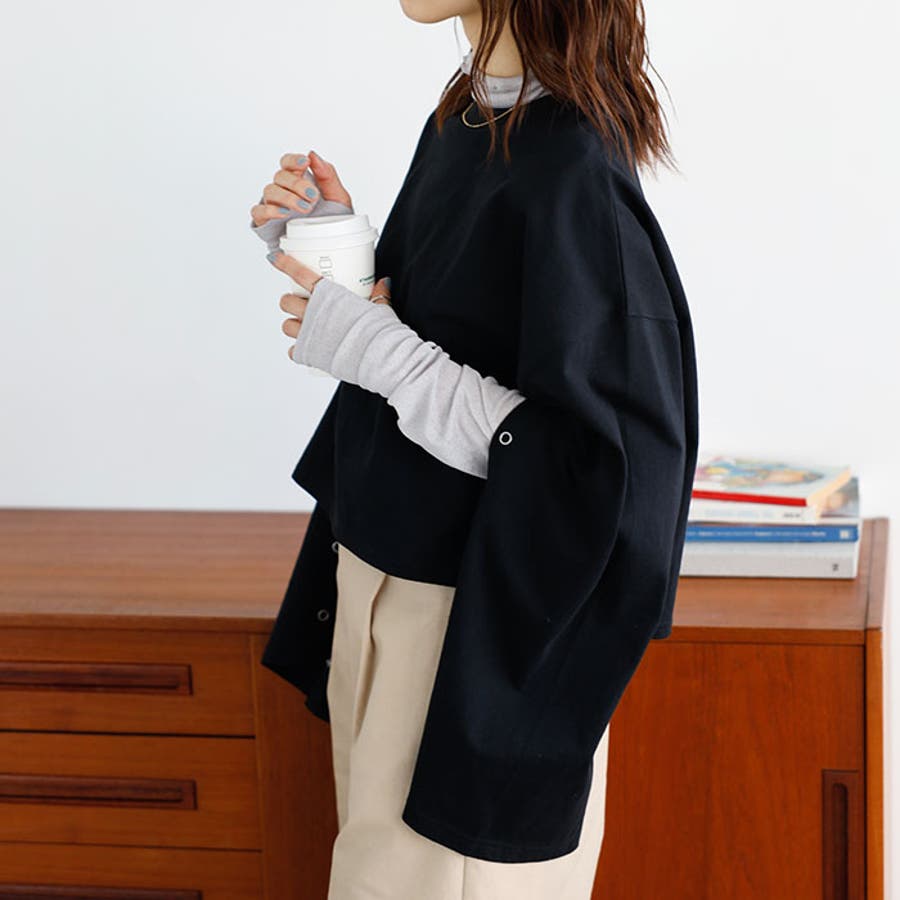 ボタンを上まで外せば、ケープのような、こなれ感のあるスタイルに。