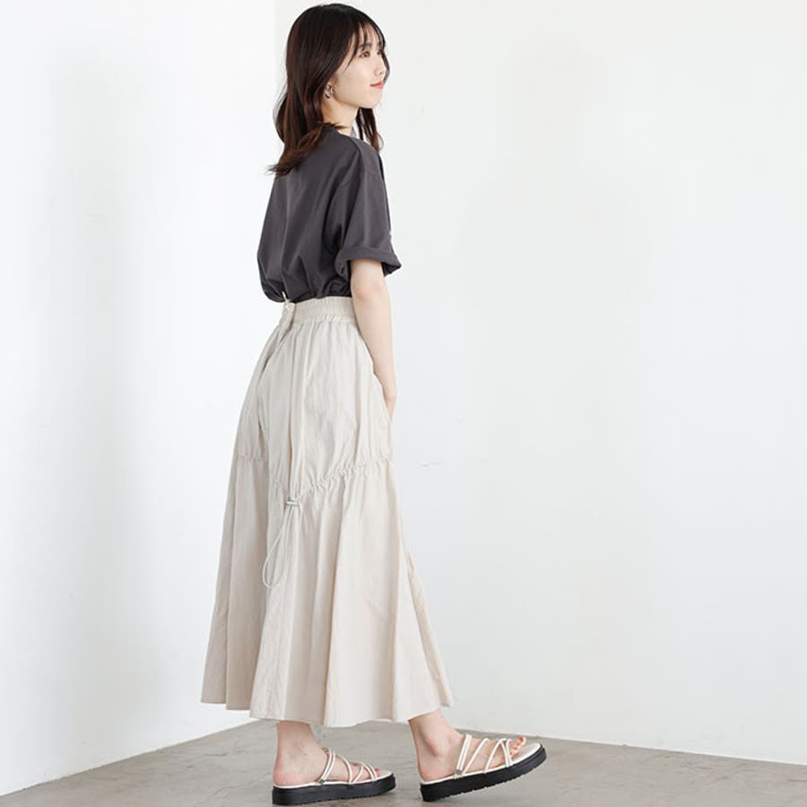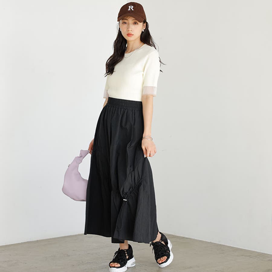 ボリューム感のあるスカートなので、すっきり見えるコンパクトトップスとの相性抜群。