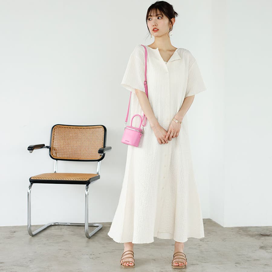 一枚で着映えるデザインなので、ミニバックをアクセントにしたラフな着こなしがおすすめ。