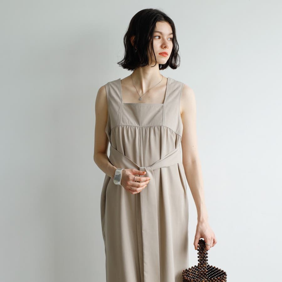 〇スクエアネックで首元をすっきりシャープに見せつつ、胸元のギャザー切替で女っぽさも忘れずに。