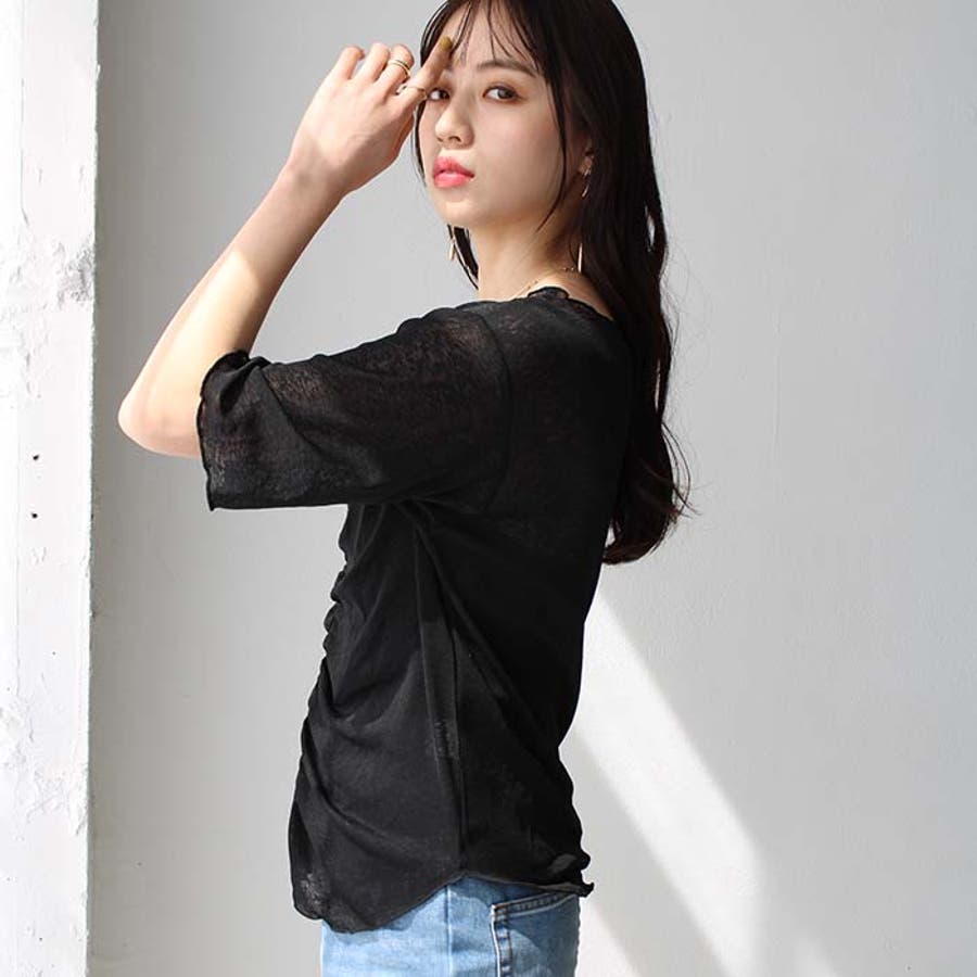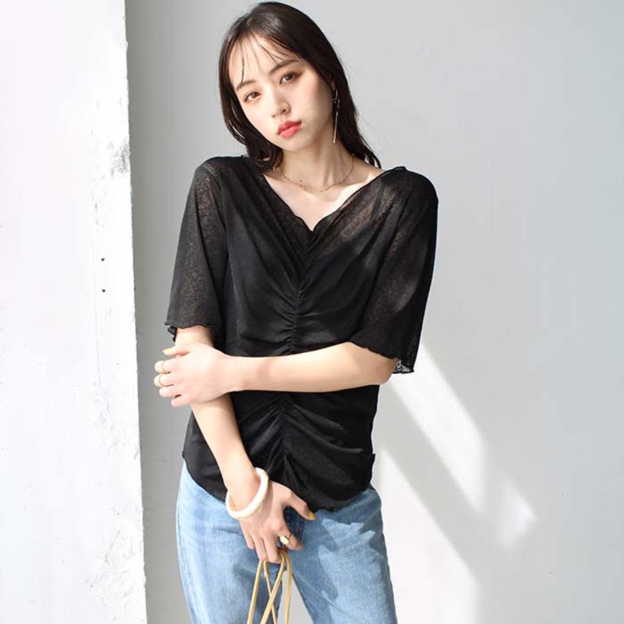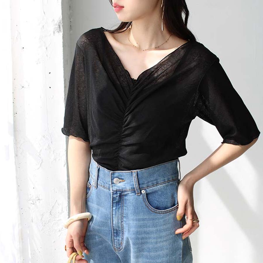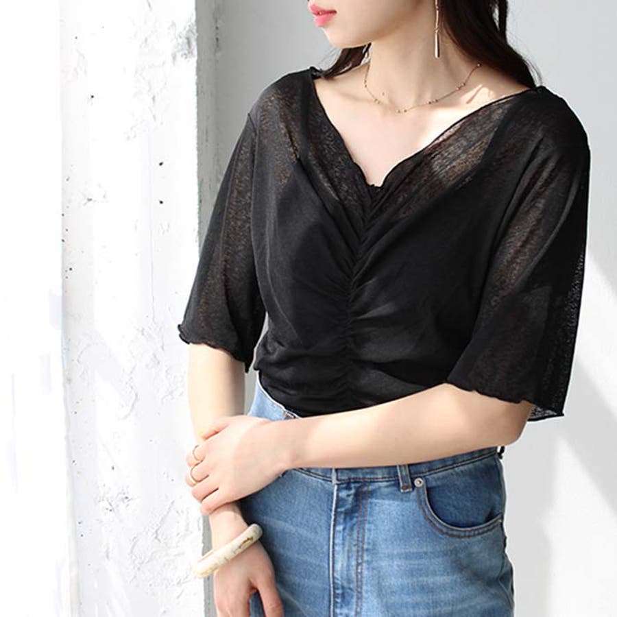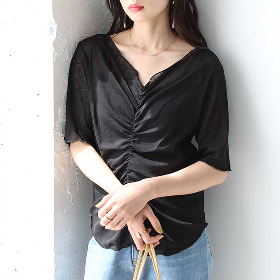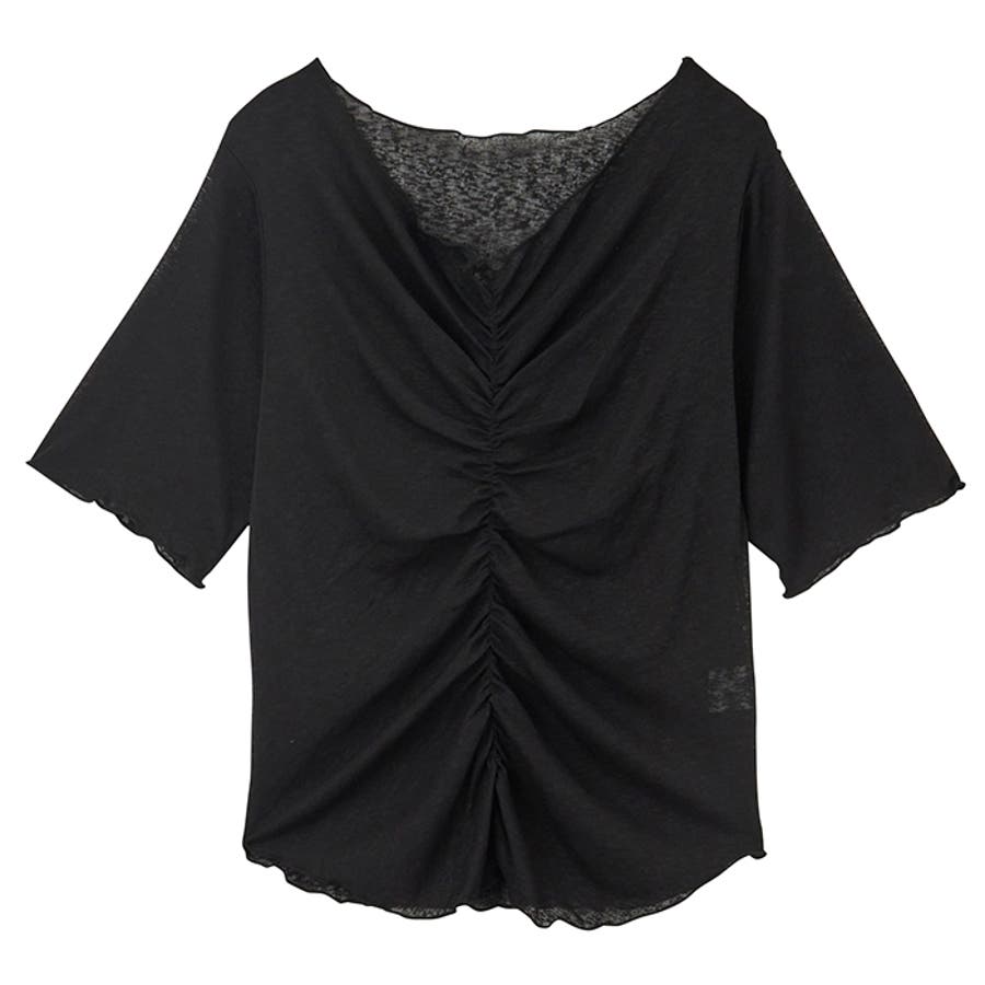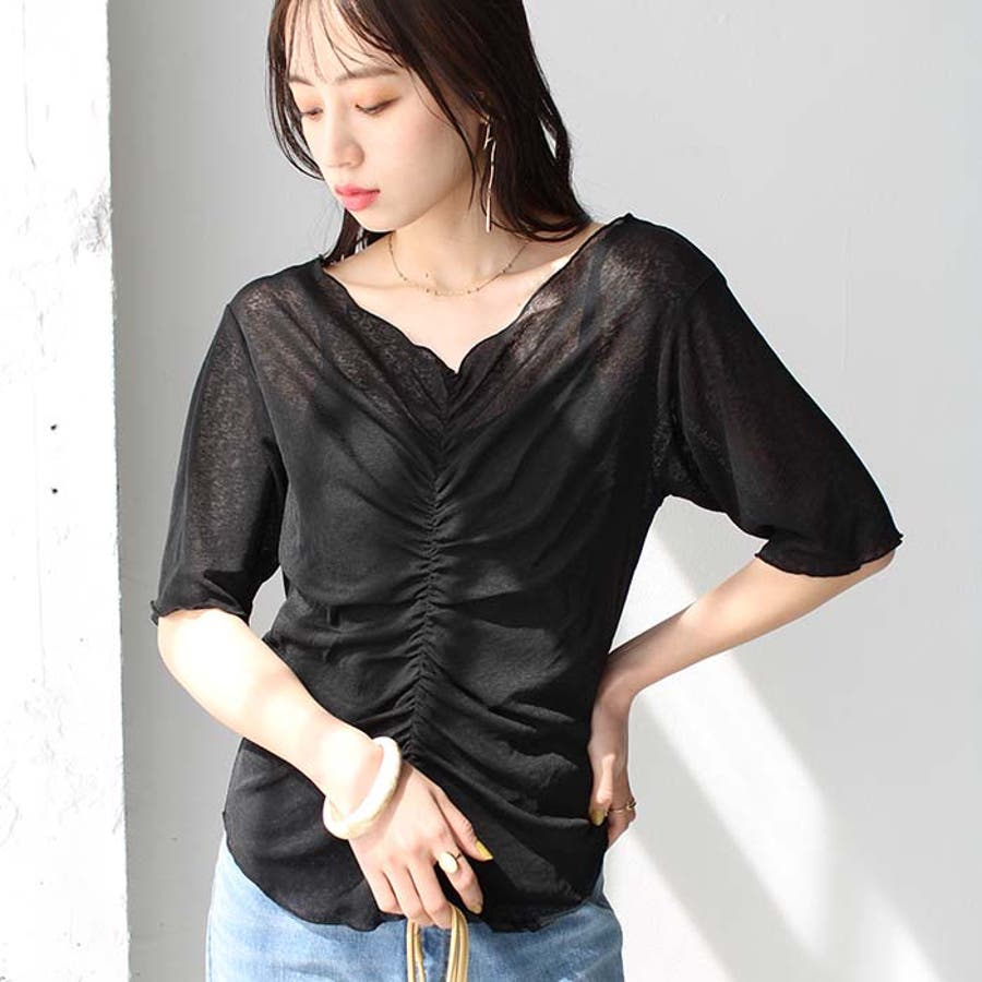 透けてるから黒でも暑苦しく見えにくいし、胸元のギャザーデザインが可愛いです!!そんなに細身ではないのでLにしましたが、程よくゆるっと着れてよかったです!