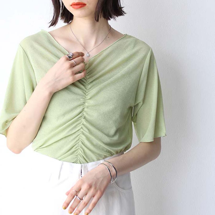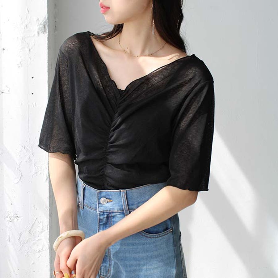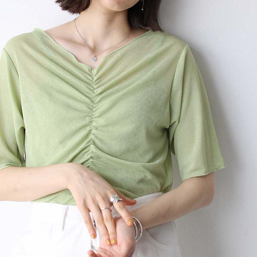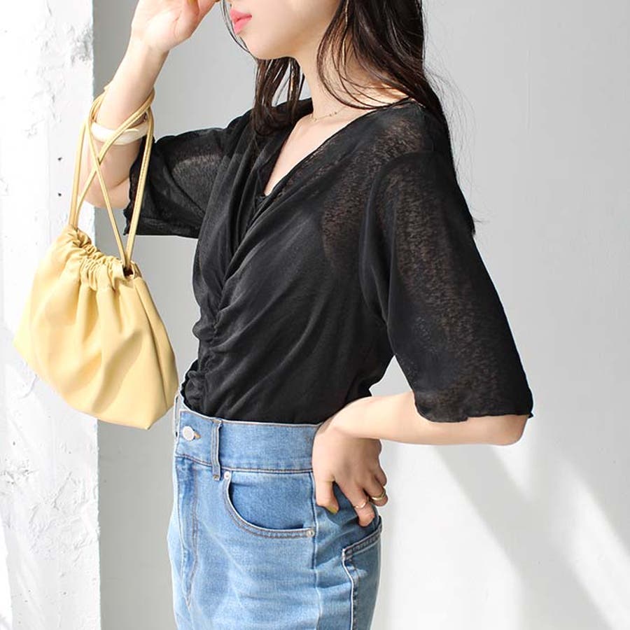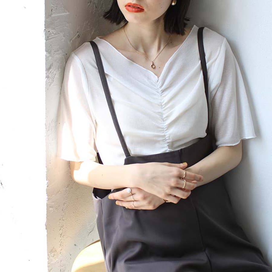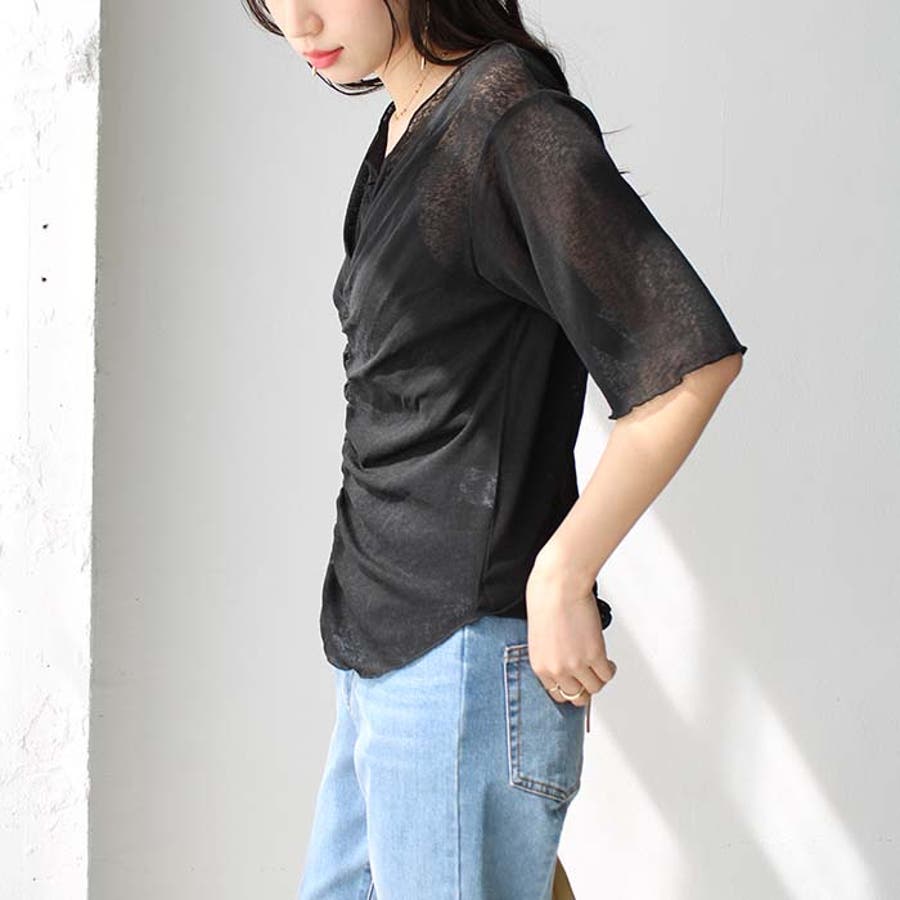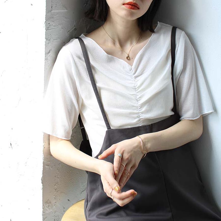 透けてるから黒でも暑苦しく見えにくいし、胸元のギャザーデザインが可愛いです!!そんなに細身ではないのでLにしましたが、程よくゆるっと着れてよかったです!