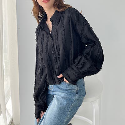 〇トレンドライクなフリンジジャカードで、1枚で主役級の華やかなブラウス