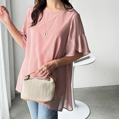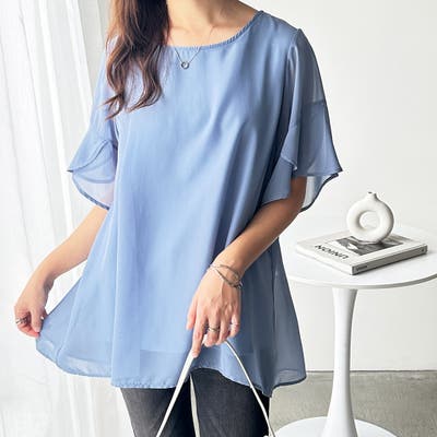 程よい透け感のあるシフォン素材のブラウスの肩部分に、