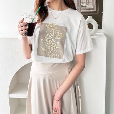 立体感ある箔プリントを施したフラワーデザインと洗練されたロゴプリントのTシャツ。