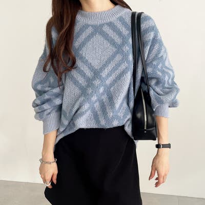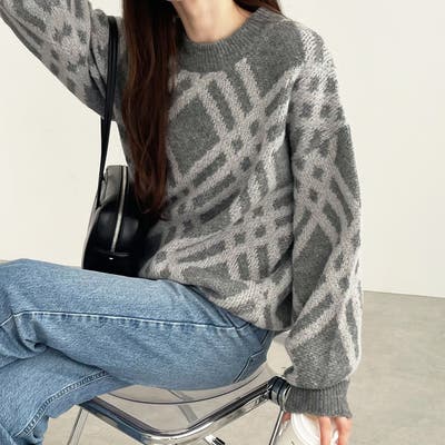 配色のチェック柄が印象的な主役級ニット。