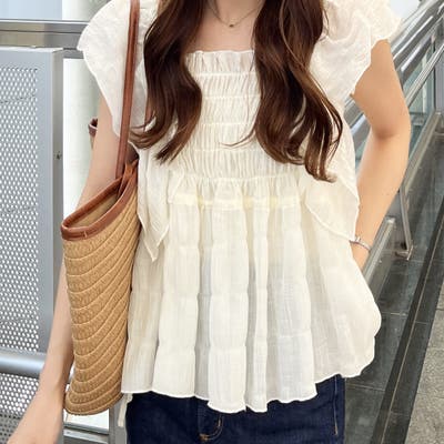シャーリングディティールを詰め込んだ華やかな主役級トップス。