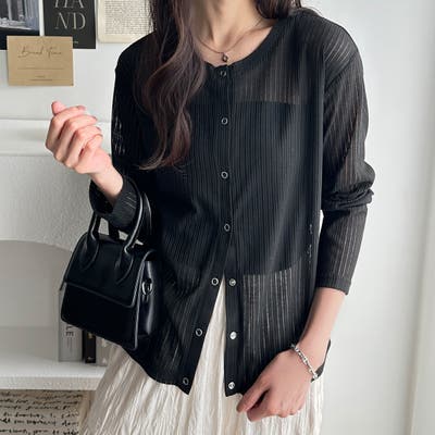 カーディガン使いで、インナーにキャミソールやベアトップを合わせた大人っぽいスタイリングも素敵。