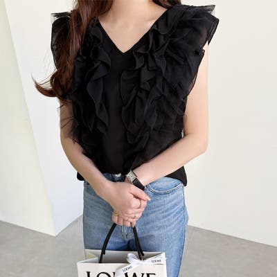 シアー感のあるフリルデザインで甘すぎない大人フェミニンなデザインブラウス。