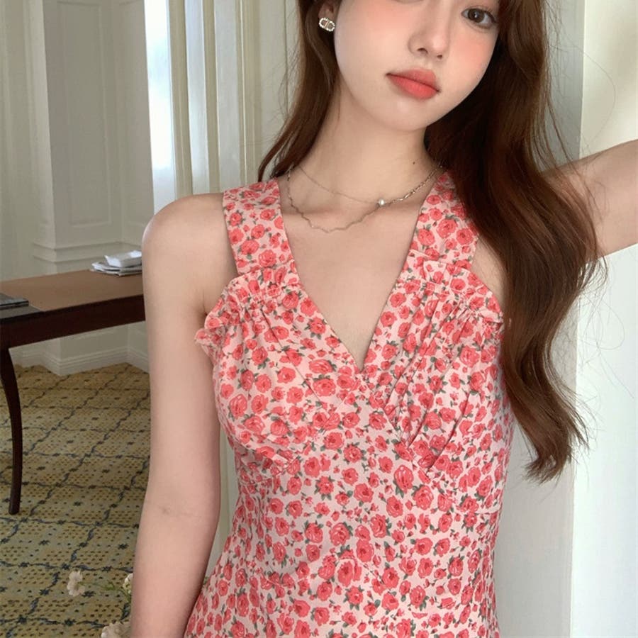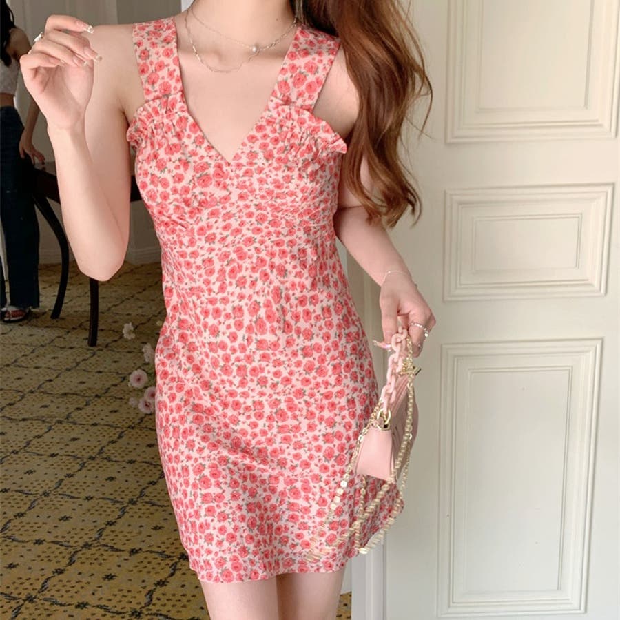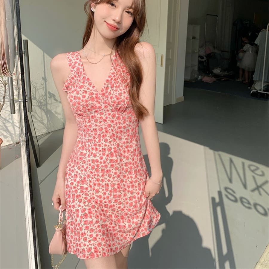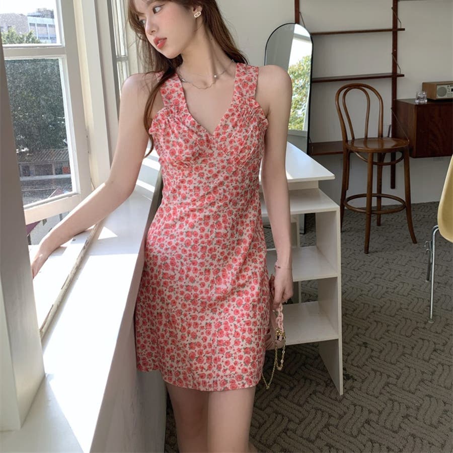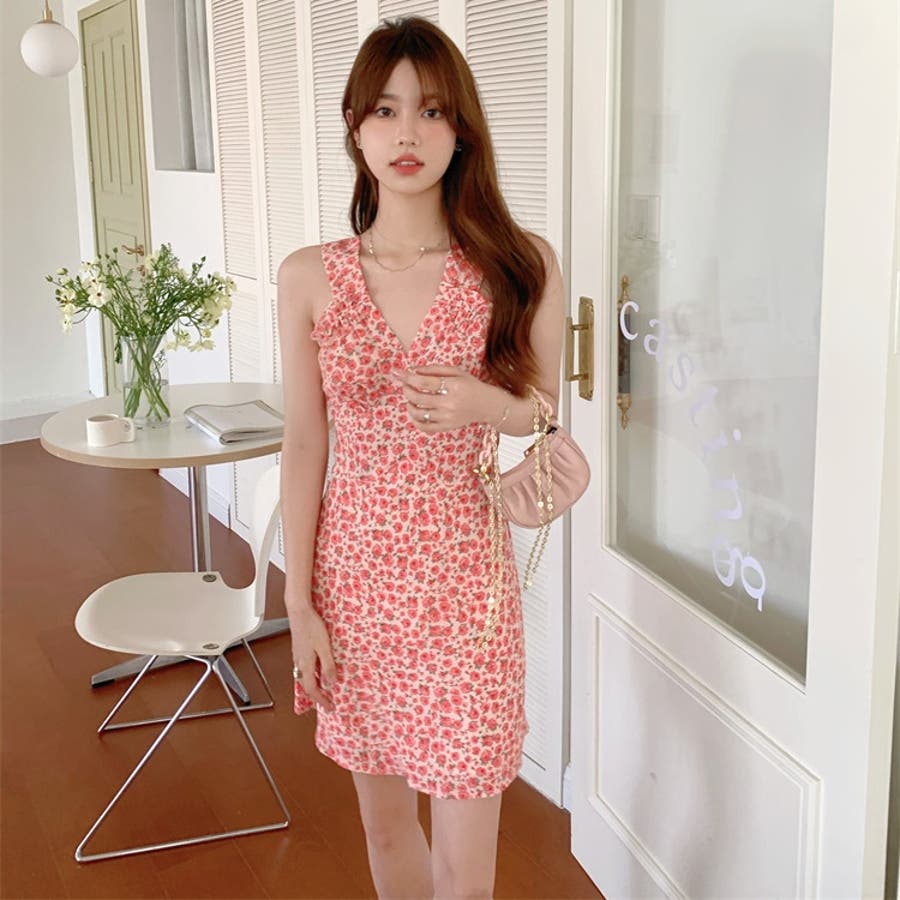 レディース 花柄 ワンピース スカート 大人 シンプル カジュアル ミニ丈 Vネック チュニック ミニ ノースリーブ 夏