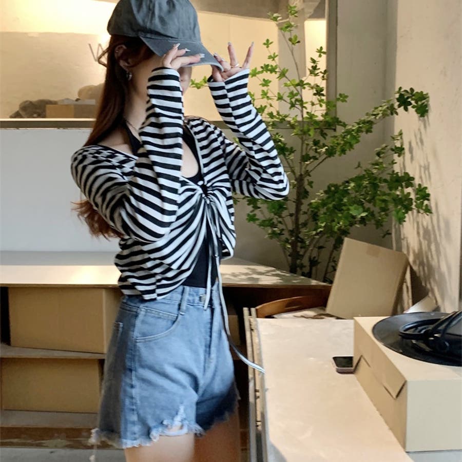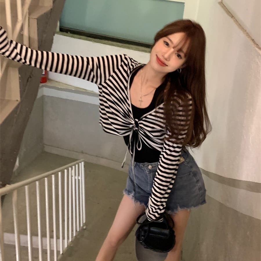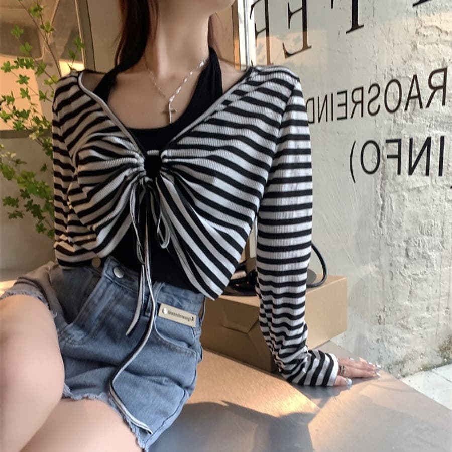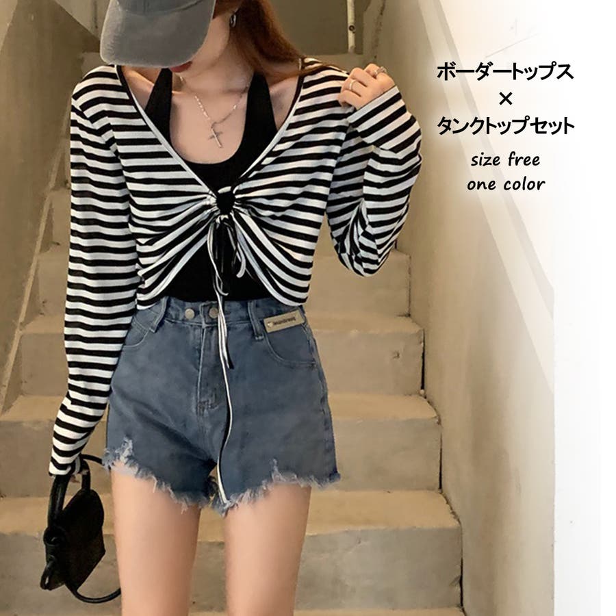 レディース 長袖 トップス カジュアル セット タンクトップ ボーダー ショート丈 春 夏 秋