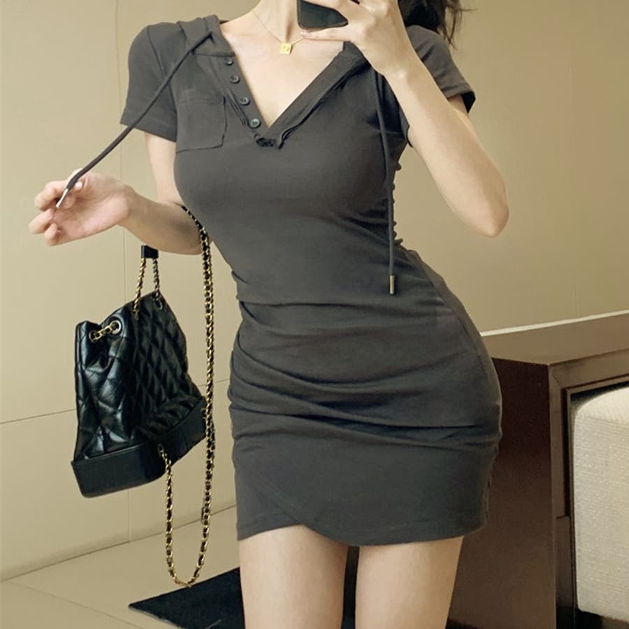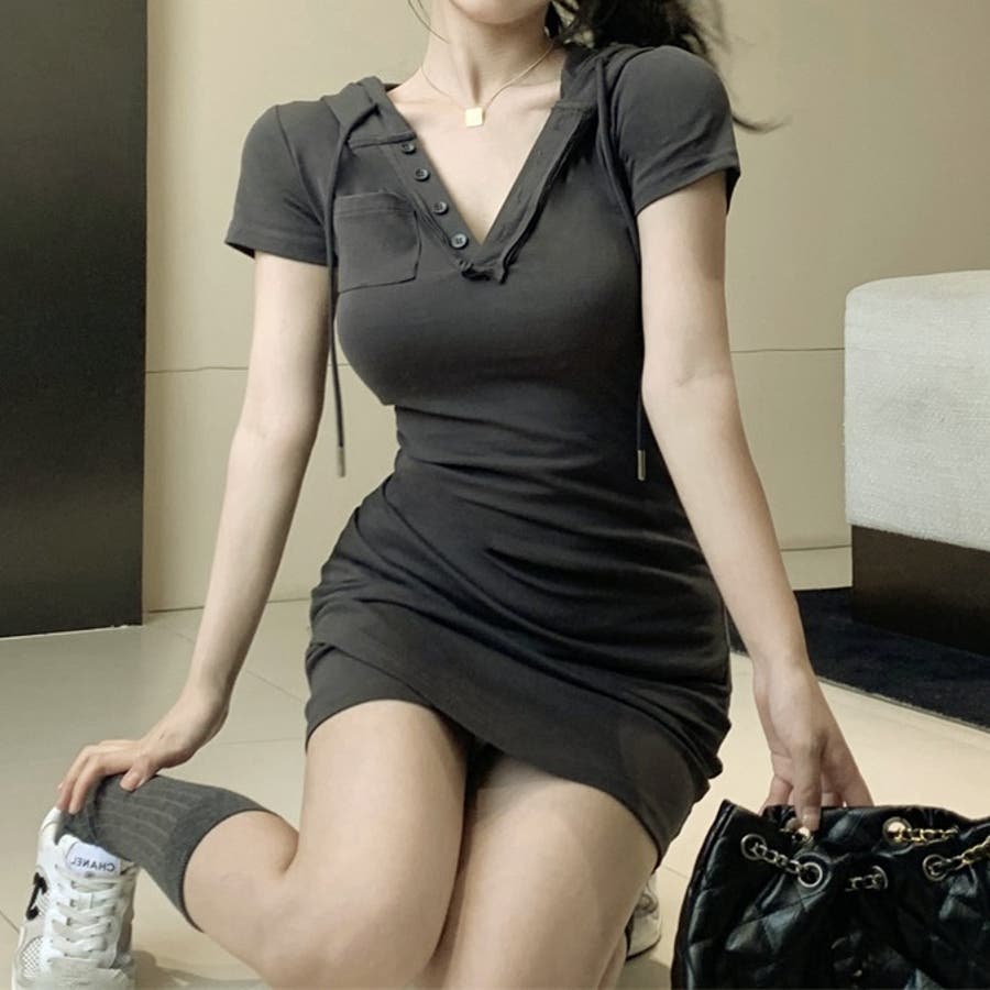 Vネックチュニック丈フード付Tシャツミニワンピース 10352