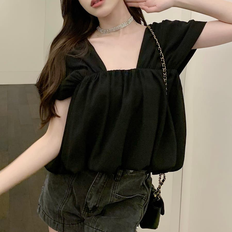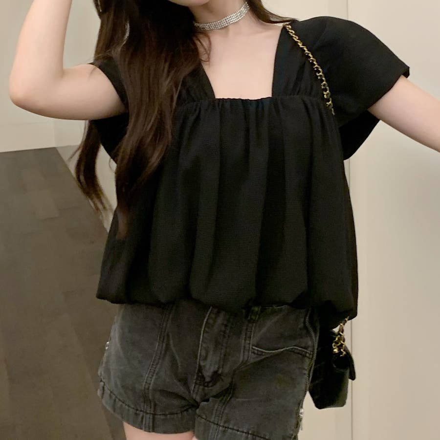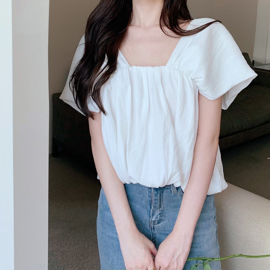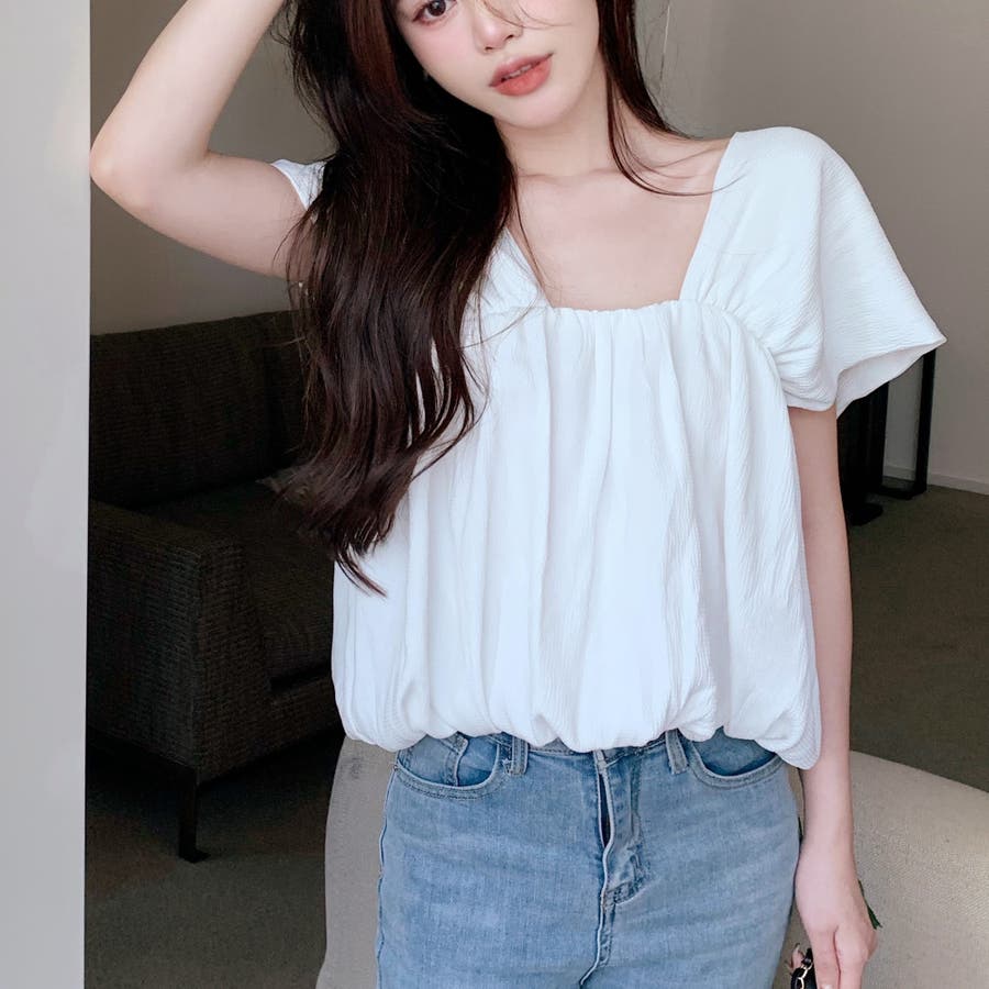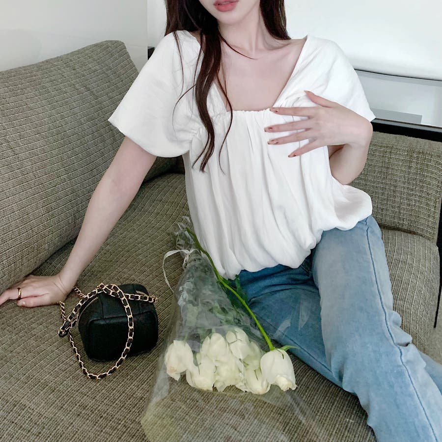 レディース プルオーバー カットソー ブラウス 半袖 フェミニン 韓国 ボリューム スリーブ ギャザー トップス