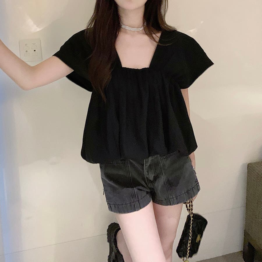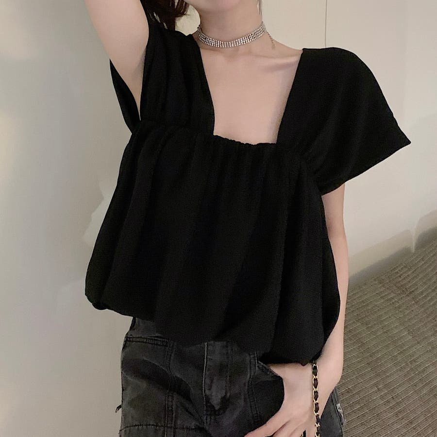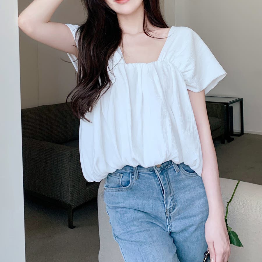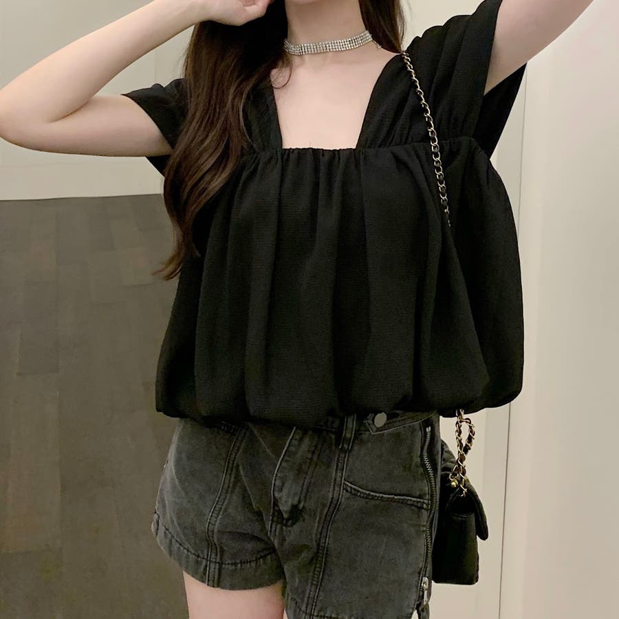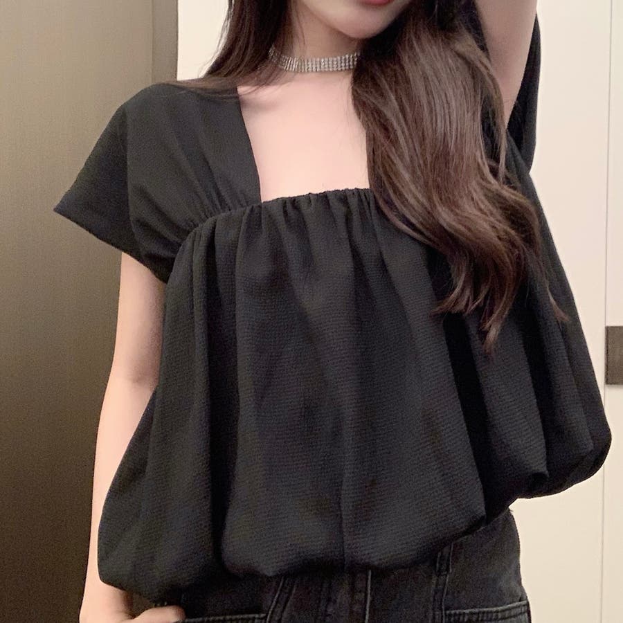 レディース プルオーバー カットソー ブラウス 半袖 フェミニン 韓国 ボリューム スリーブ ギャザー トップス