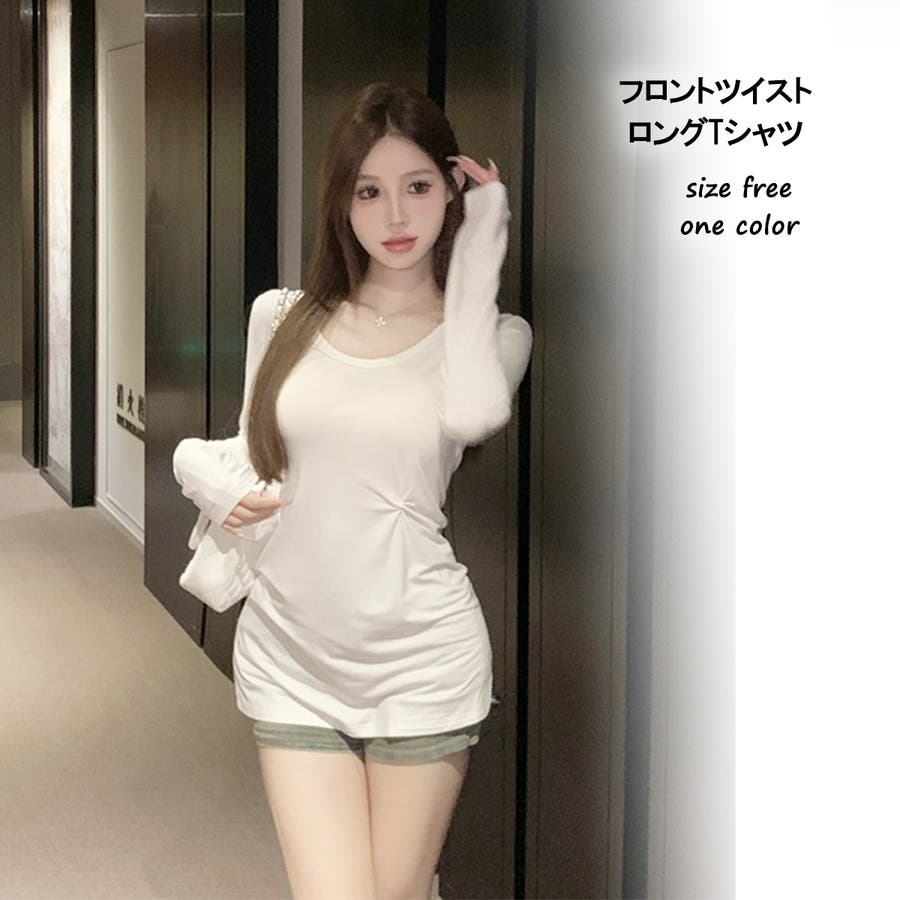 レディース 長袖 トップス カットソー シンプル ストリート カジュアル フロント ツイスト ロング Tシャツ ロンT 秋 春 夏 韓国 シアー