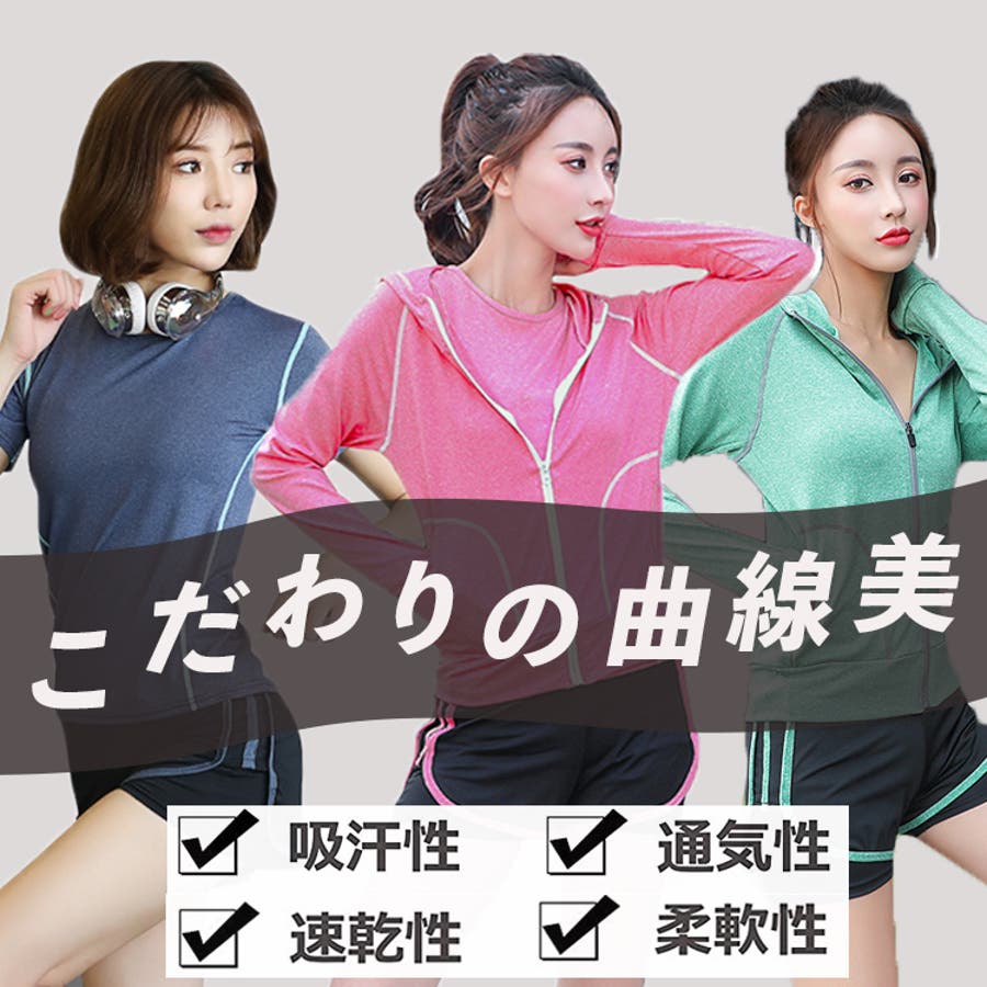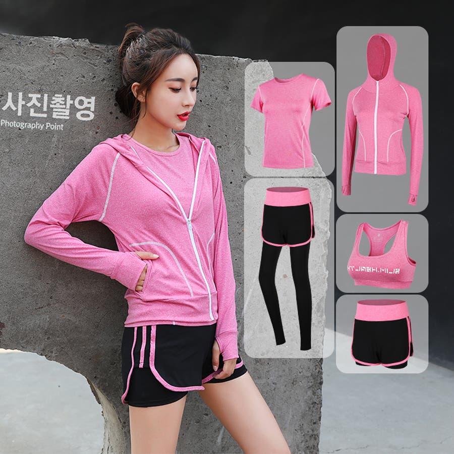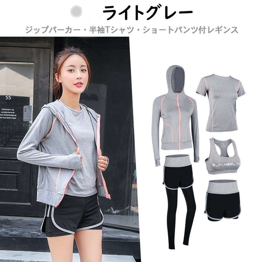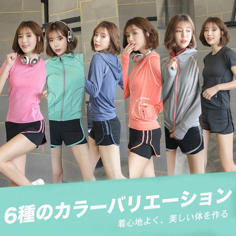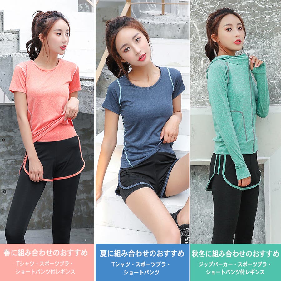 着心地の良いシームレス素材を使っており、スポーツブラ・ショートパンツ・レギンス・ジップパーカー・半袖Tシャツの5点がセットになっているのでこれからスポーツを始める方にもおすすめにアイテムです。