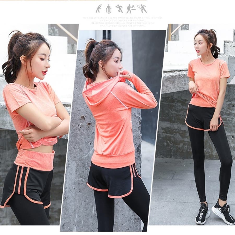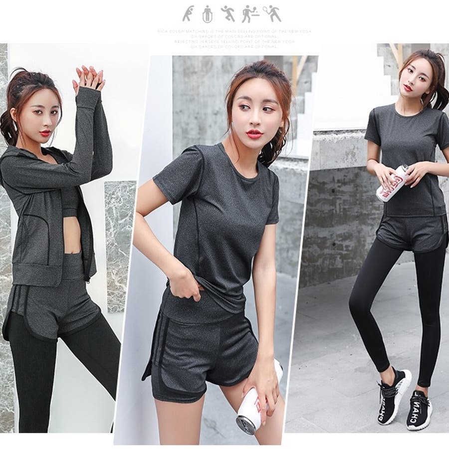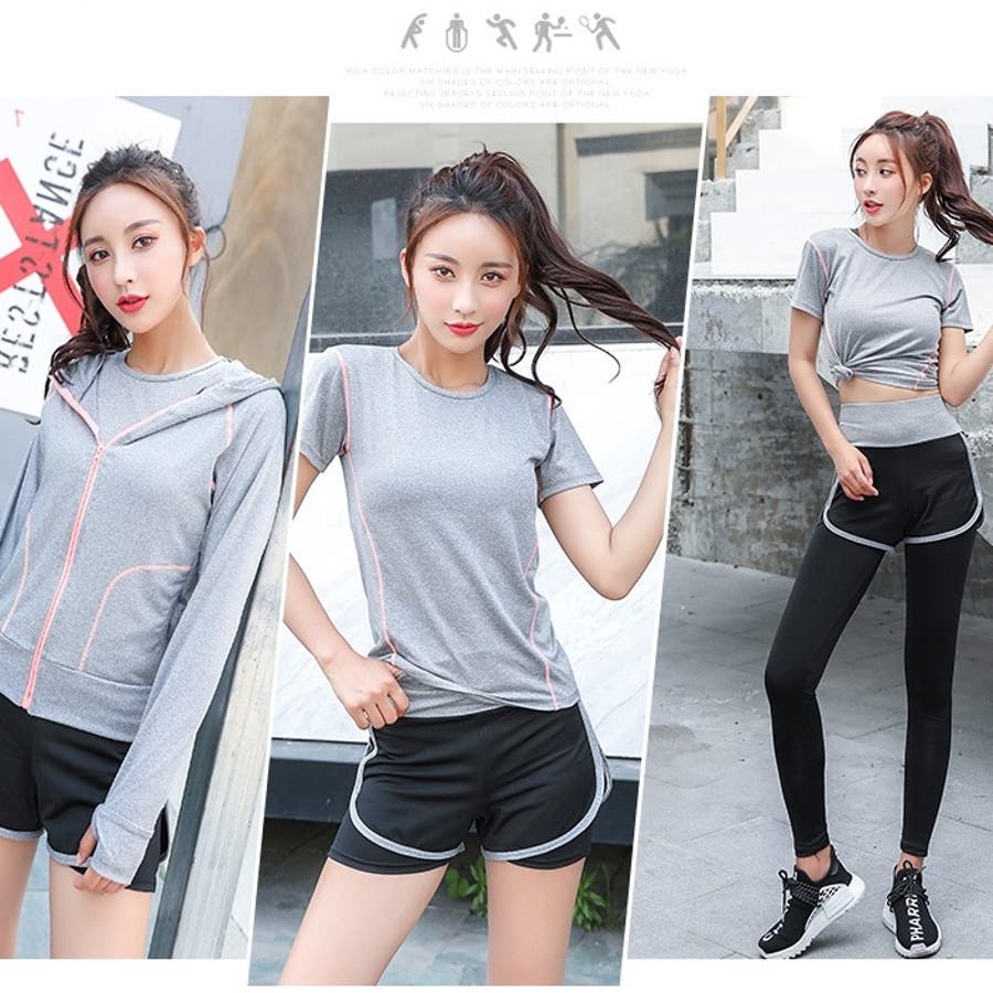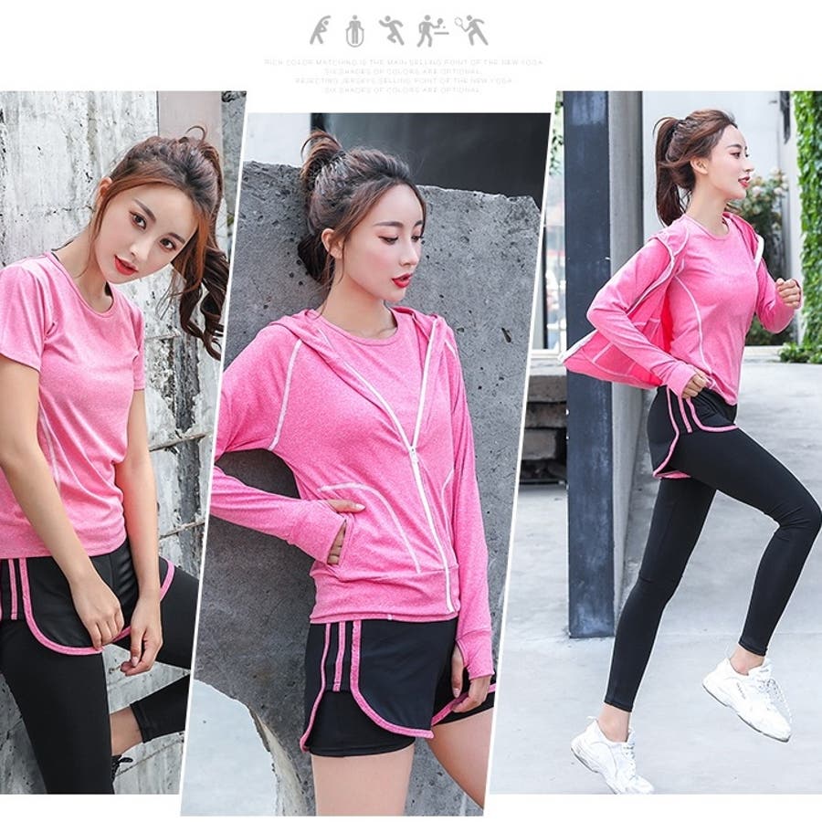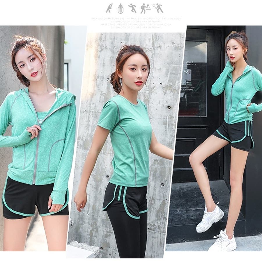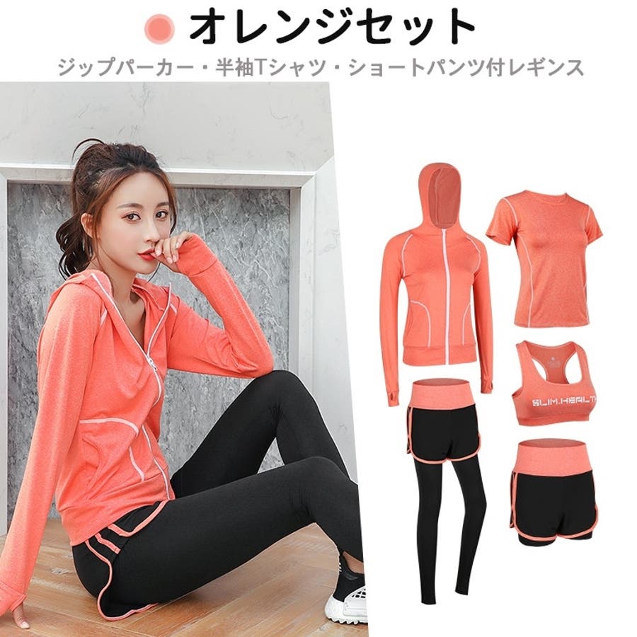着心地の良いシームレス素材を使っており、スポーツブラ・ショートパンツ・レギンス・ジップパーカー・半袖Tシャツの5点がセットになっているのでこれからスポーツを始める方にもおすすめにアイテムです。