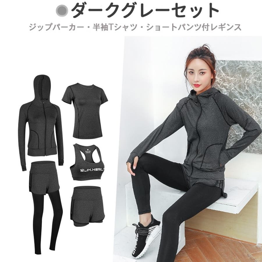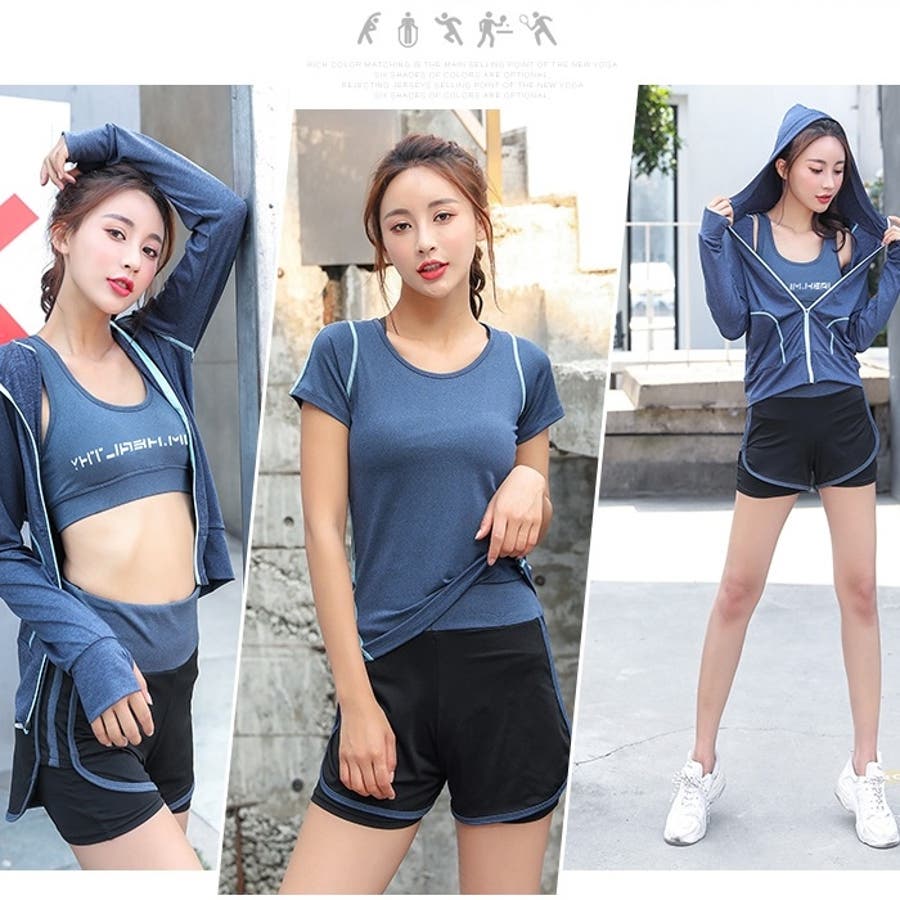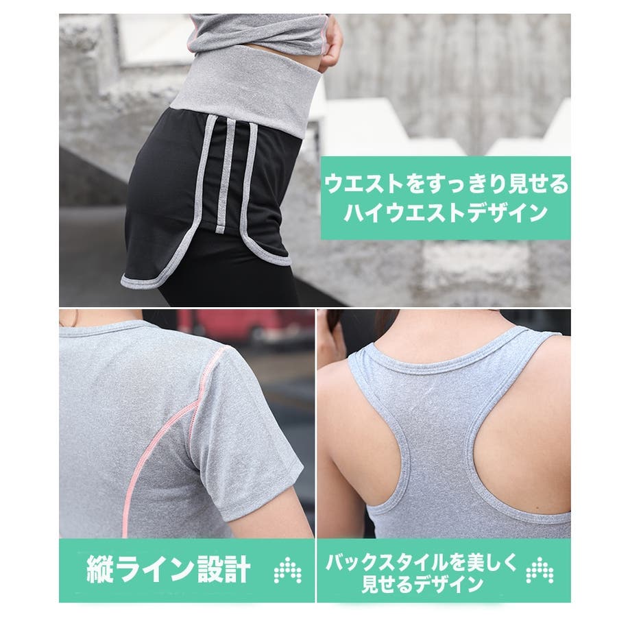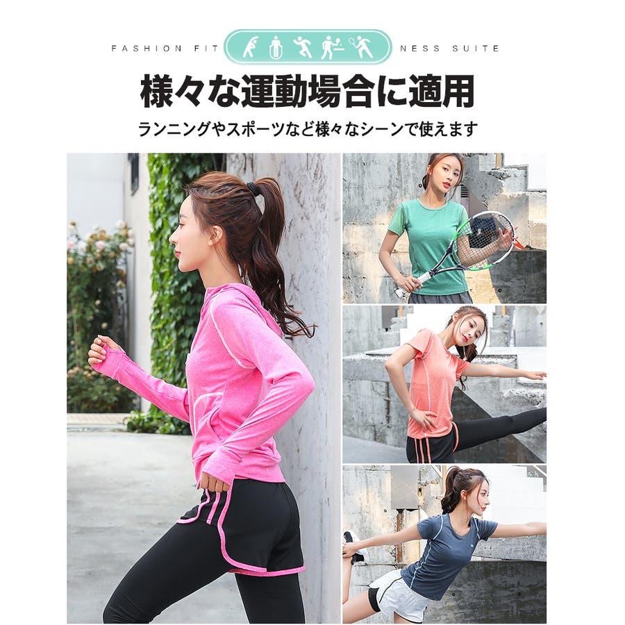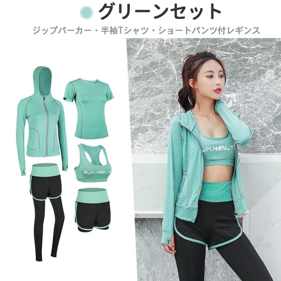 着心地の良いシームレス素材を使っており、スポーツブラ・ショートパンツ・レギンス・ジップパーカー・半袖Tシャツの5点がセットになっているのでこれからスポーツを始める方にもおすすめにアイテムです。