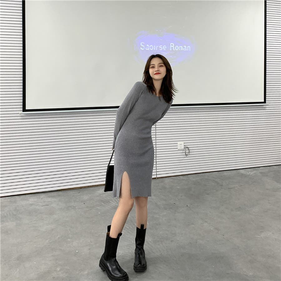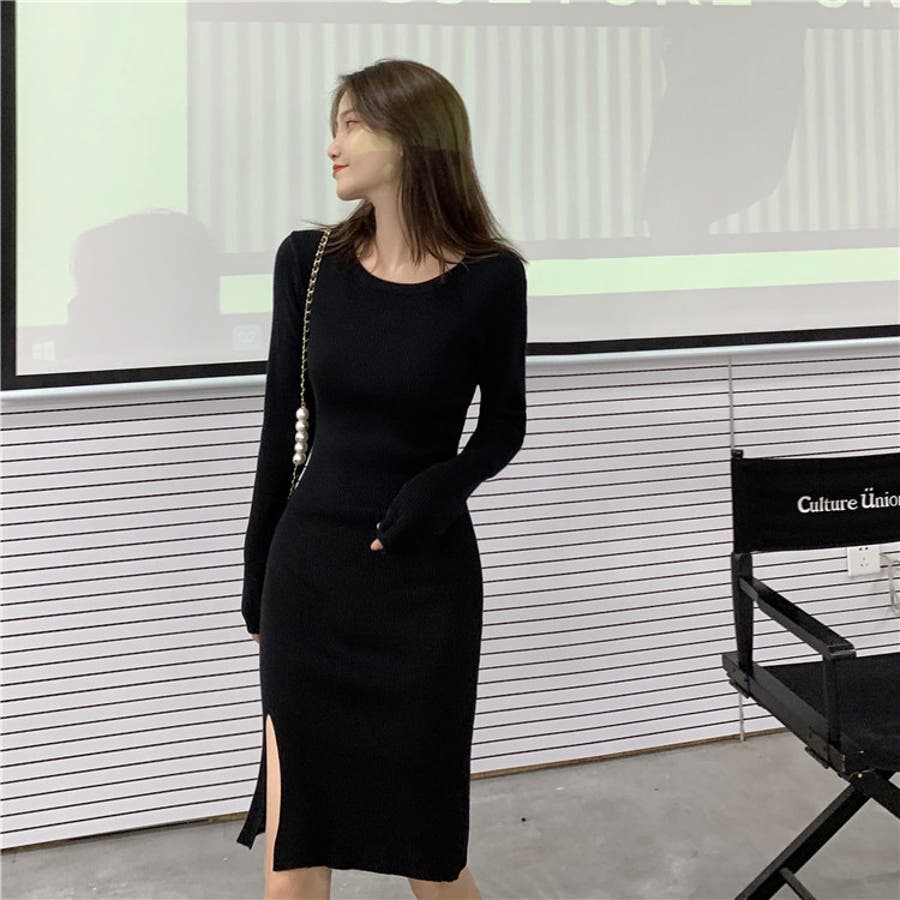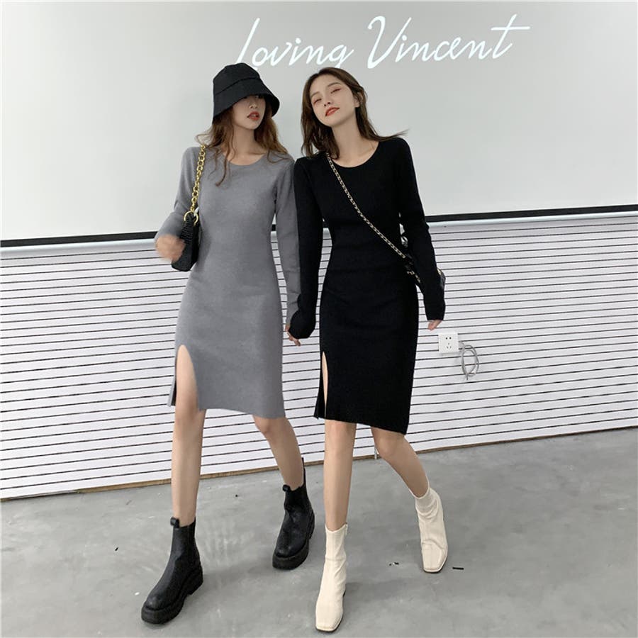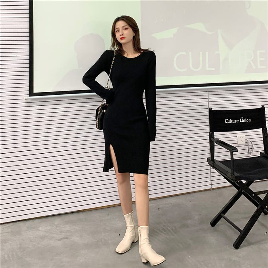 レディース トップス カットソー ニット ワンピース スカート タイト 大人 フェミニン ベーシック フロント スリット リブニット ワンピース