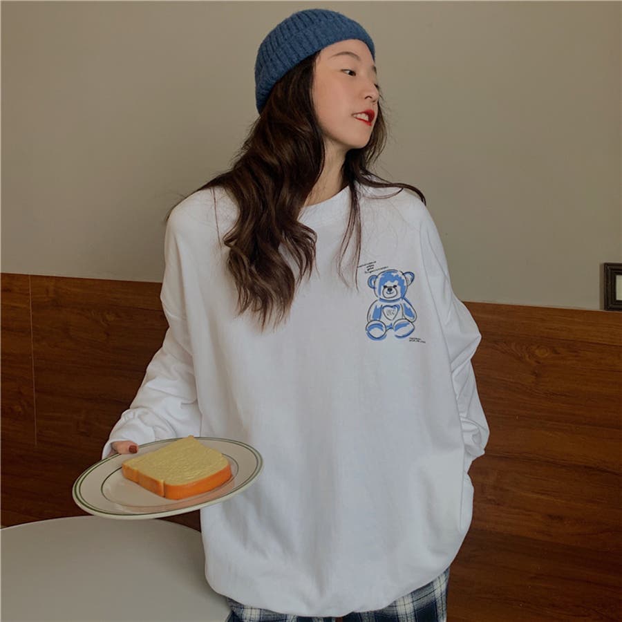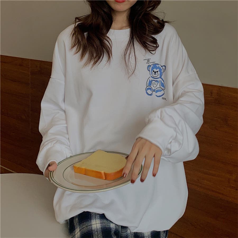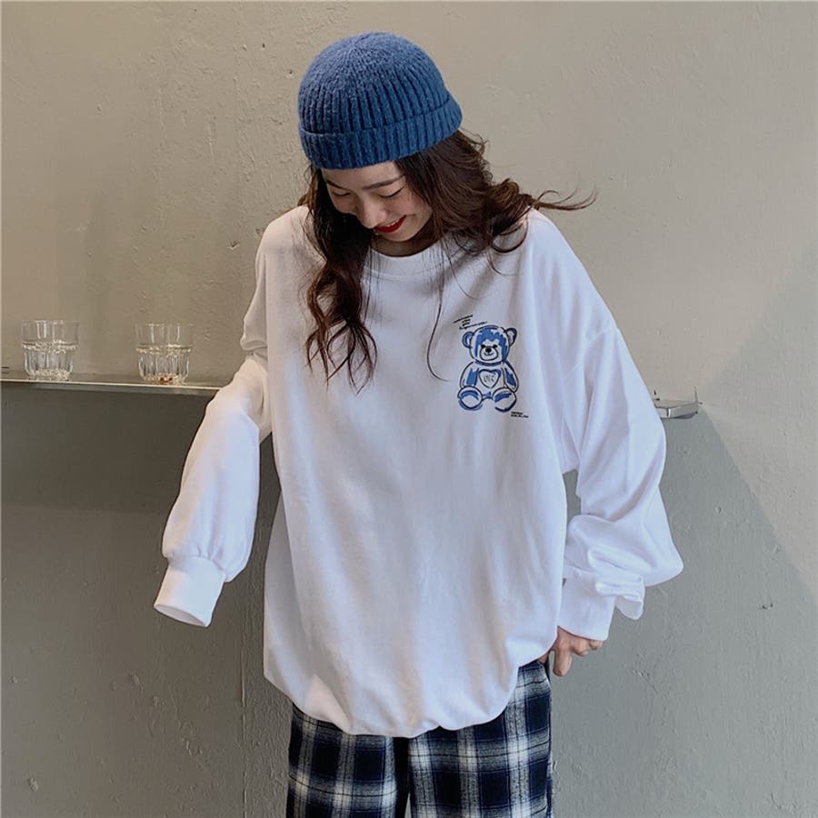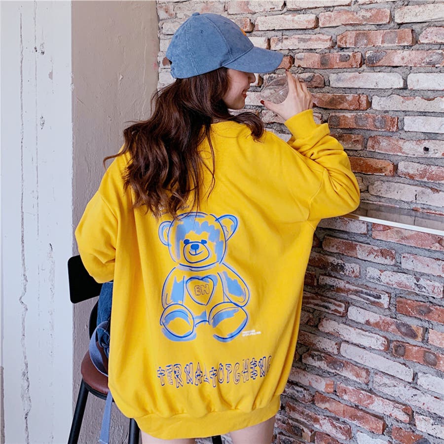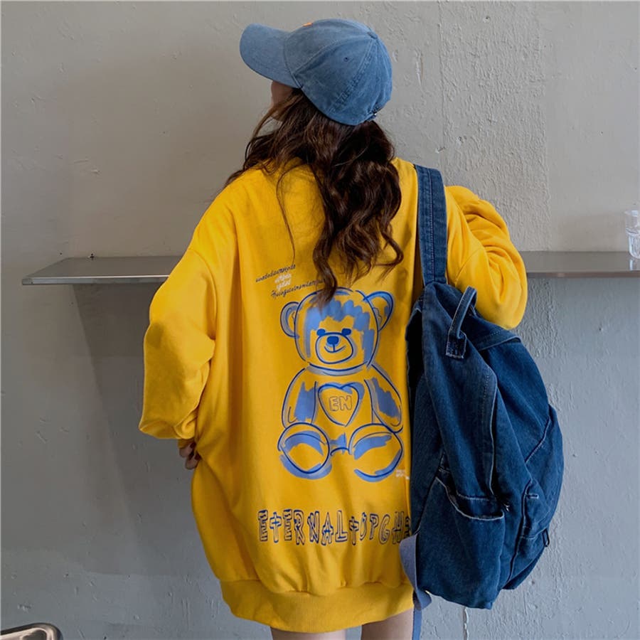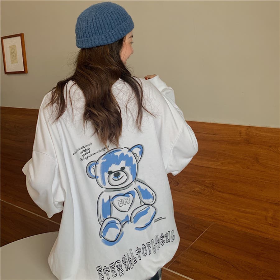 レディース トップス パーカー スウェット 長袖 カジュアル 韓国 女子 ベアー バック コンシャス プリント ベーシック トレーナー くまさん イラスト プリント 薄手トレーナー 秋 秋服 冬 韓国ファッション 体型カバー