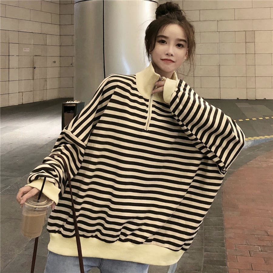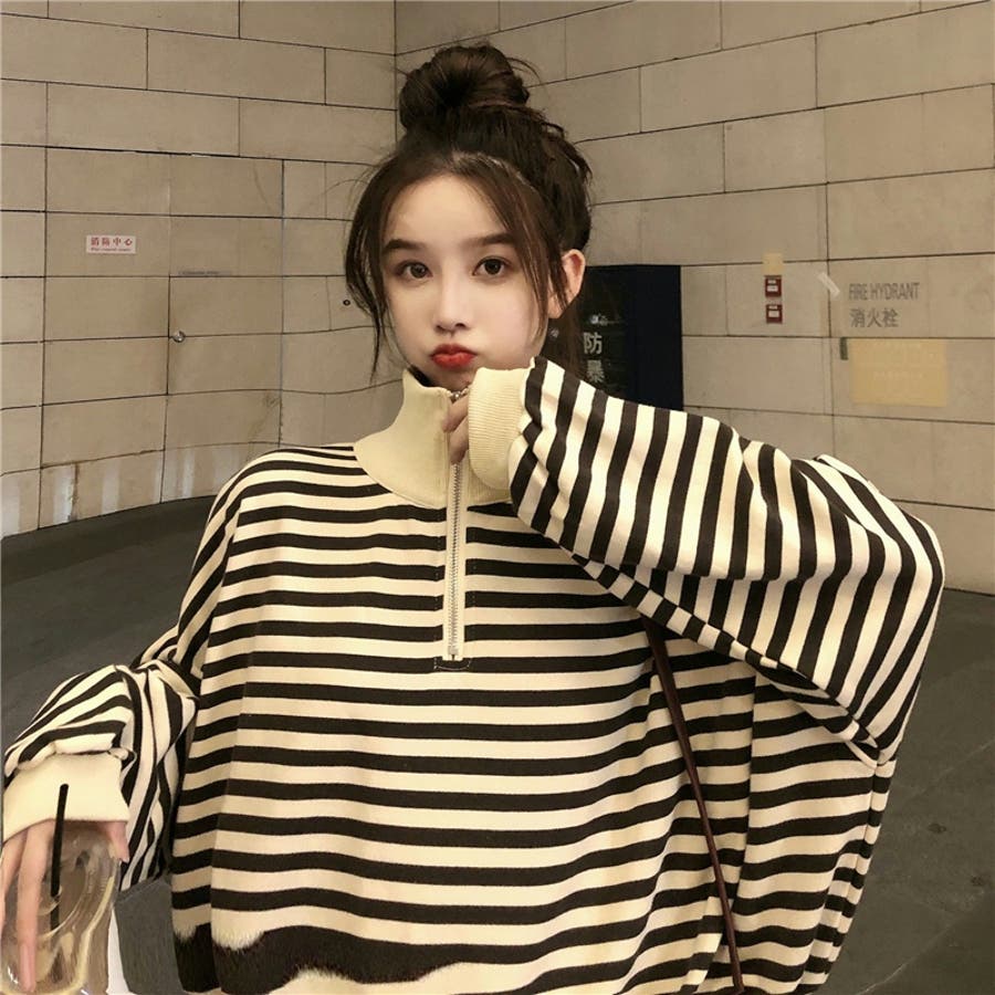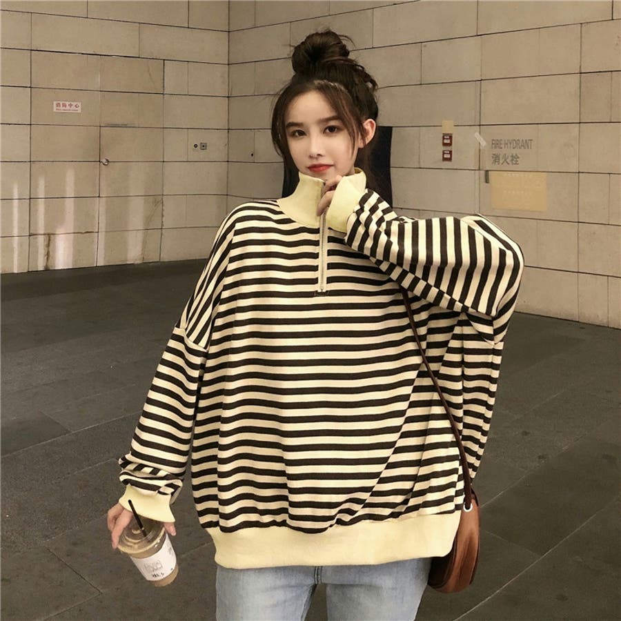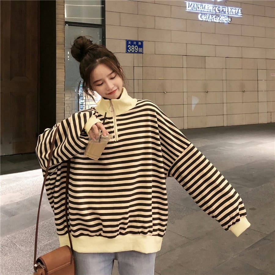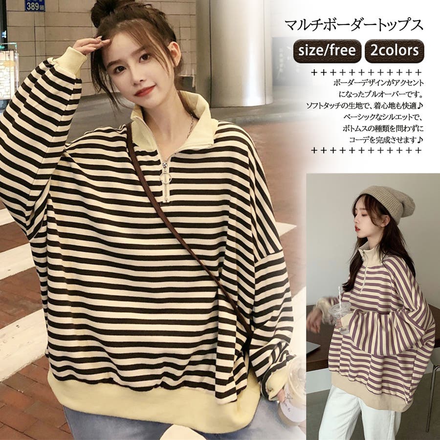 レディース 長袖 トップス トレーナー カットソー シンプル カジュアル オーバーサイズ ボーダー ハーフジップ マルチボーダー トップス