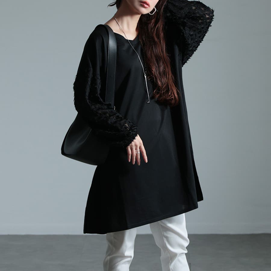 異素材デザインでこなれるフェザー袖カットソーチュニックは、ふわふわのフェザーの切り替えスリーブが季節感を感じるトレンド感を演出。
